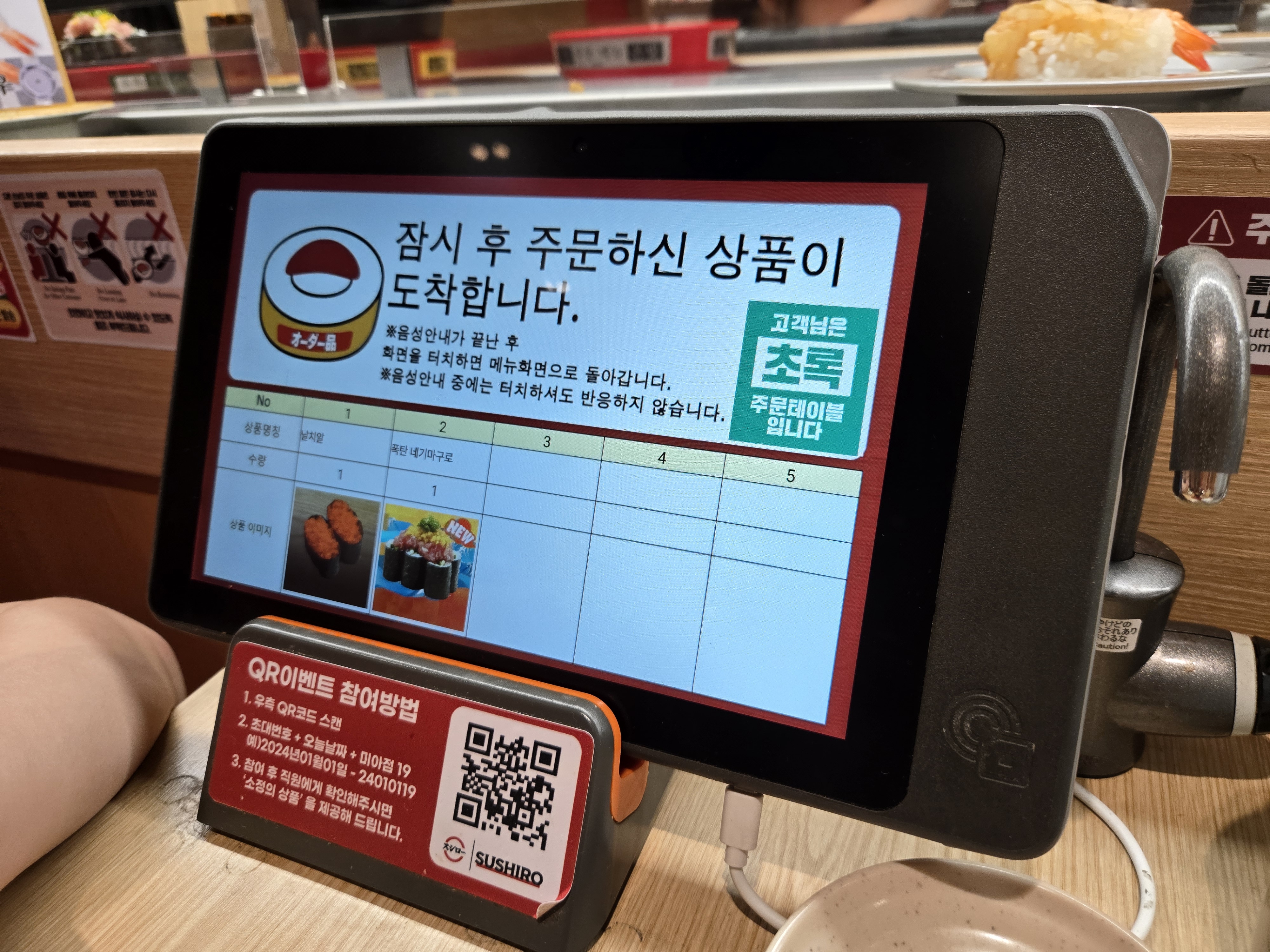 그리고 일정 시간이 지나면 주방에서 바로 만들어진 초밥이 레일을 따라 오게 되는데요~