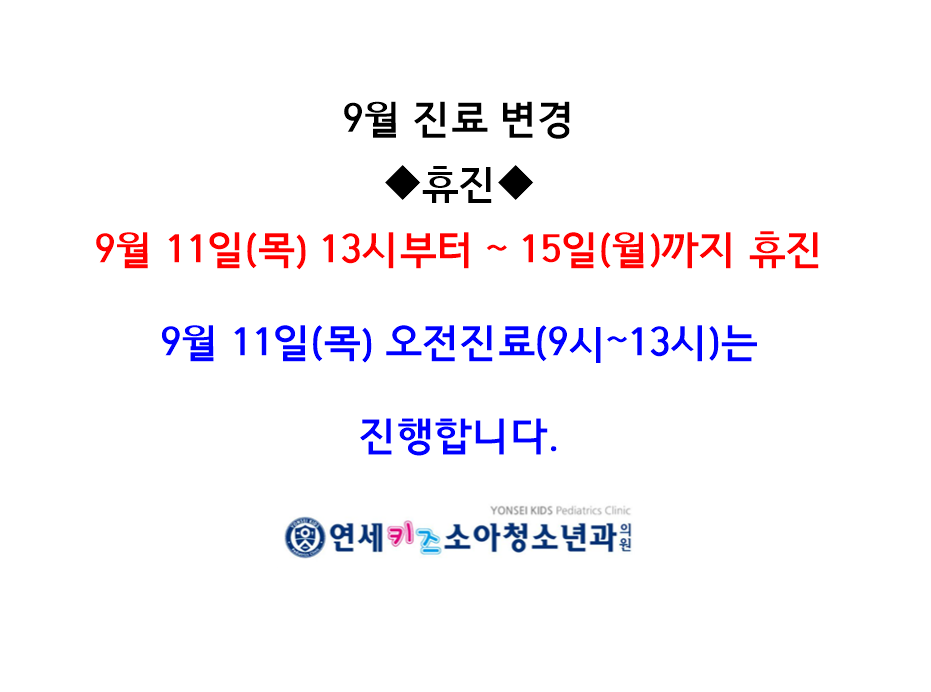 9월 11일 목요일 오후부터 ~ 9월 15일 월요일까지 휴진이 있습니다.
