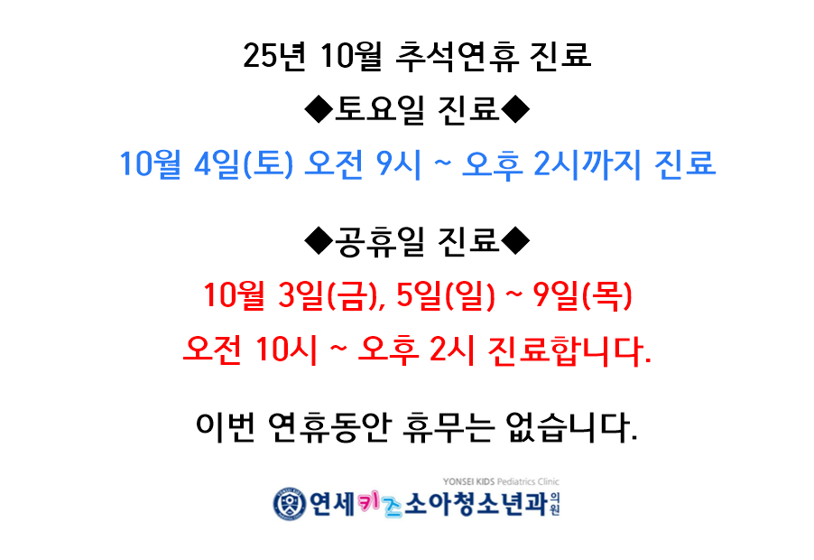 10월 3일(금), 5일(일) ~ 9일(목)은 오전 10시 ~ 오후 2시까지 진료 합니다.