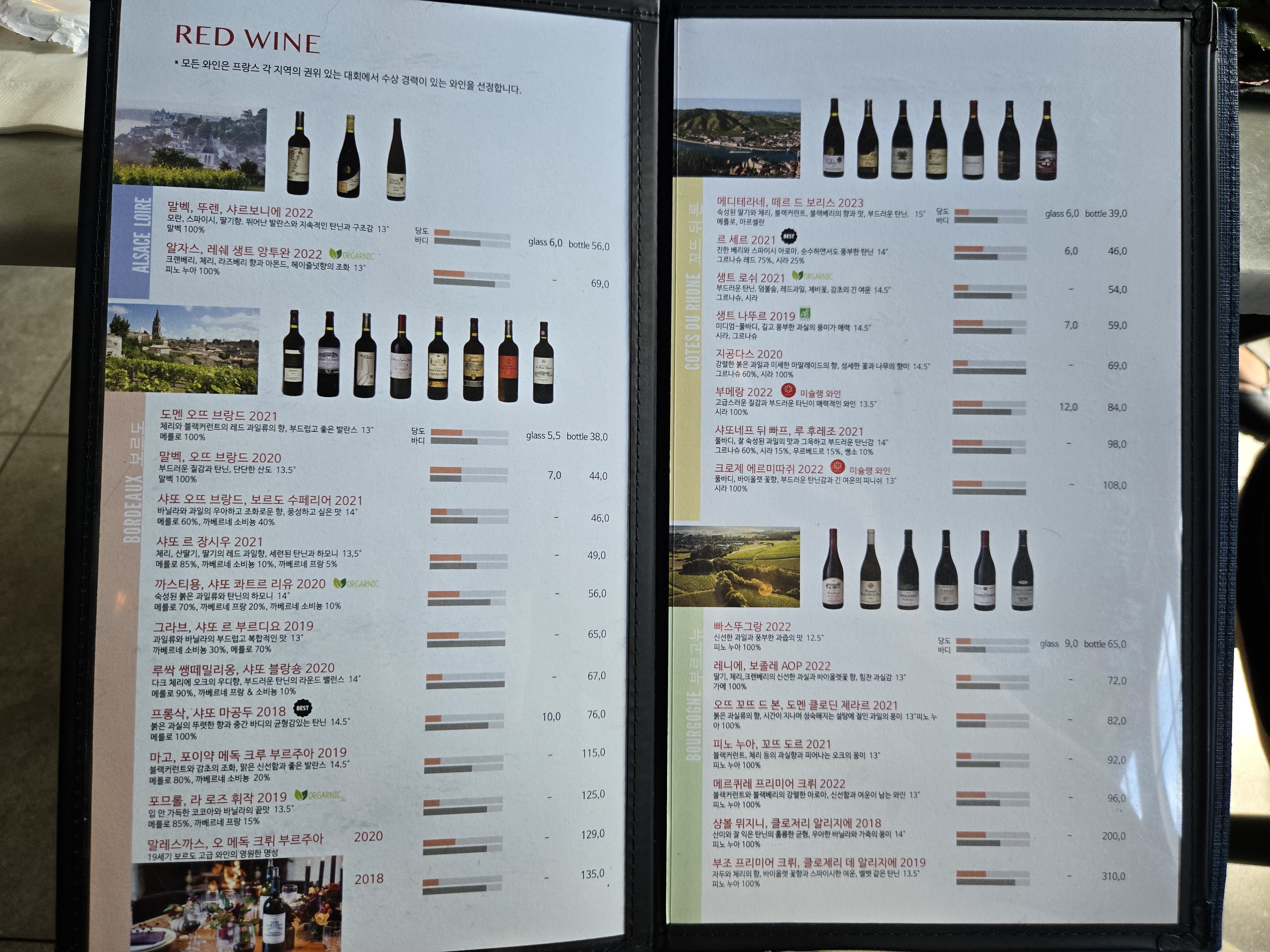 프랑스요리 답게 페어링할 수 있는 와인 종류도 굉장히 다양했습니다.