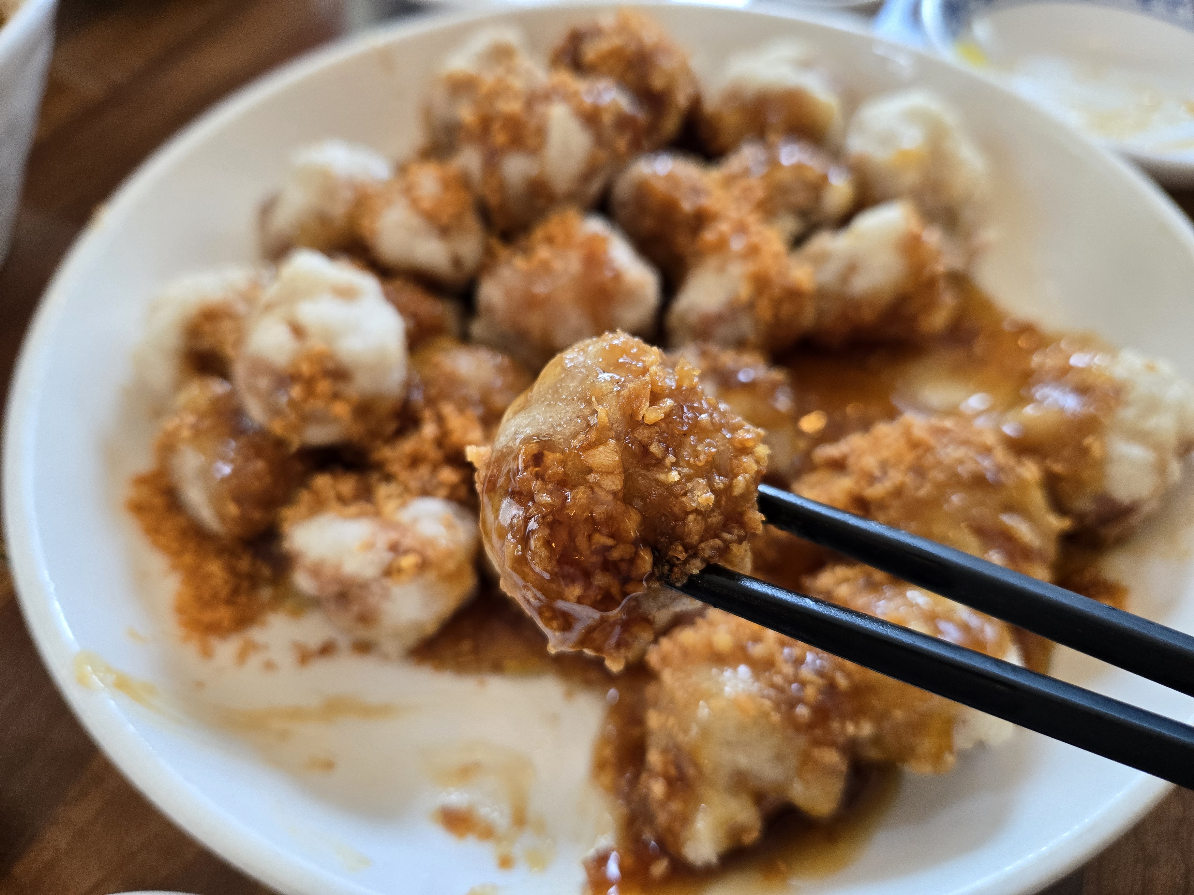 동글동글하게 먹기 좋은 크기로 겉바속촉으로 튀겨낸 찹쌀탕수육에