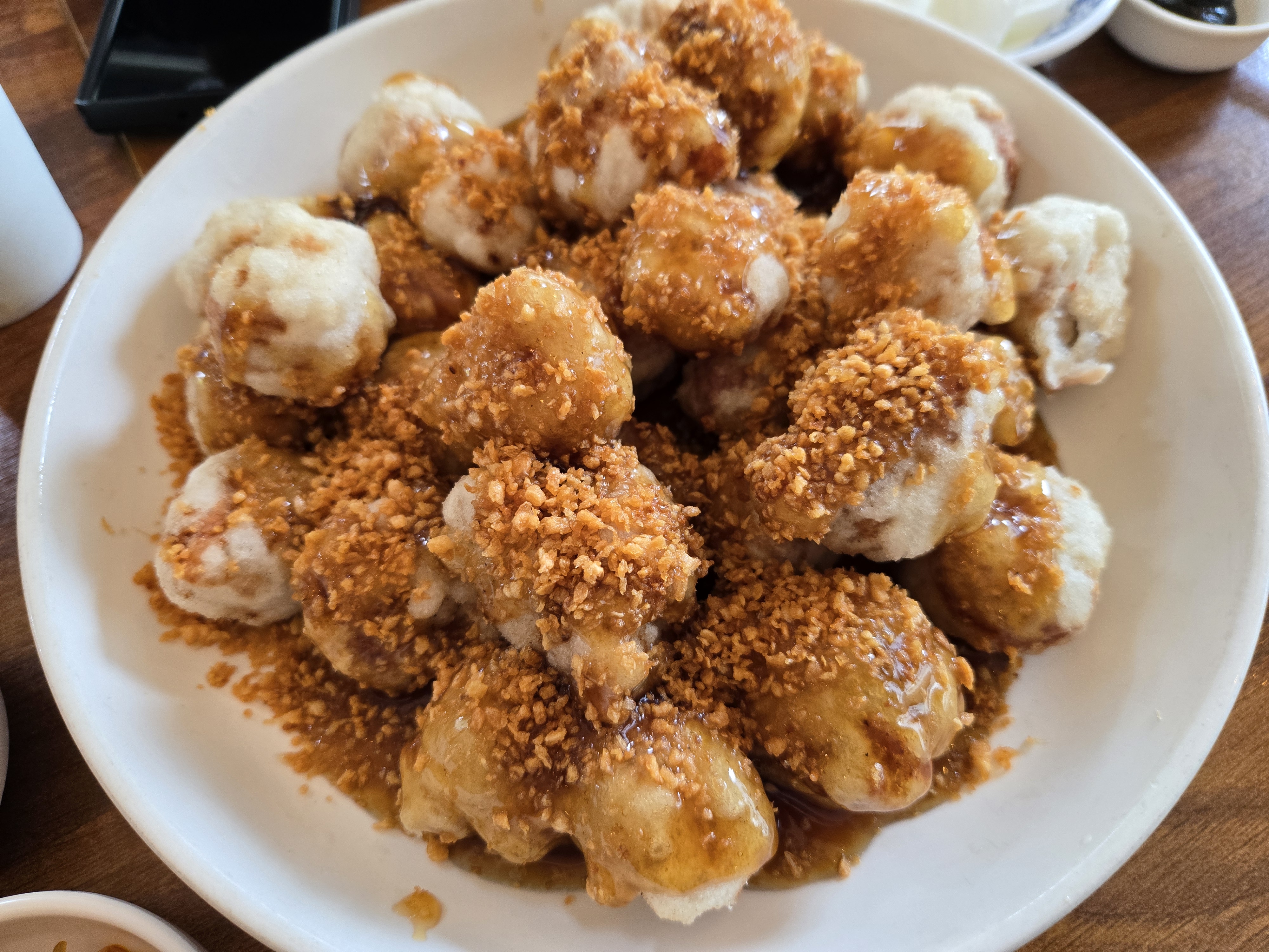 새콤달콤한 소스와 바삭한 마늘푸레이크를 아낌없이 뿌린 요리였습니다.