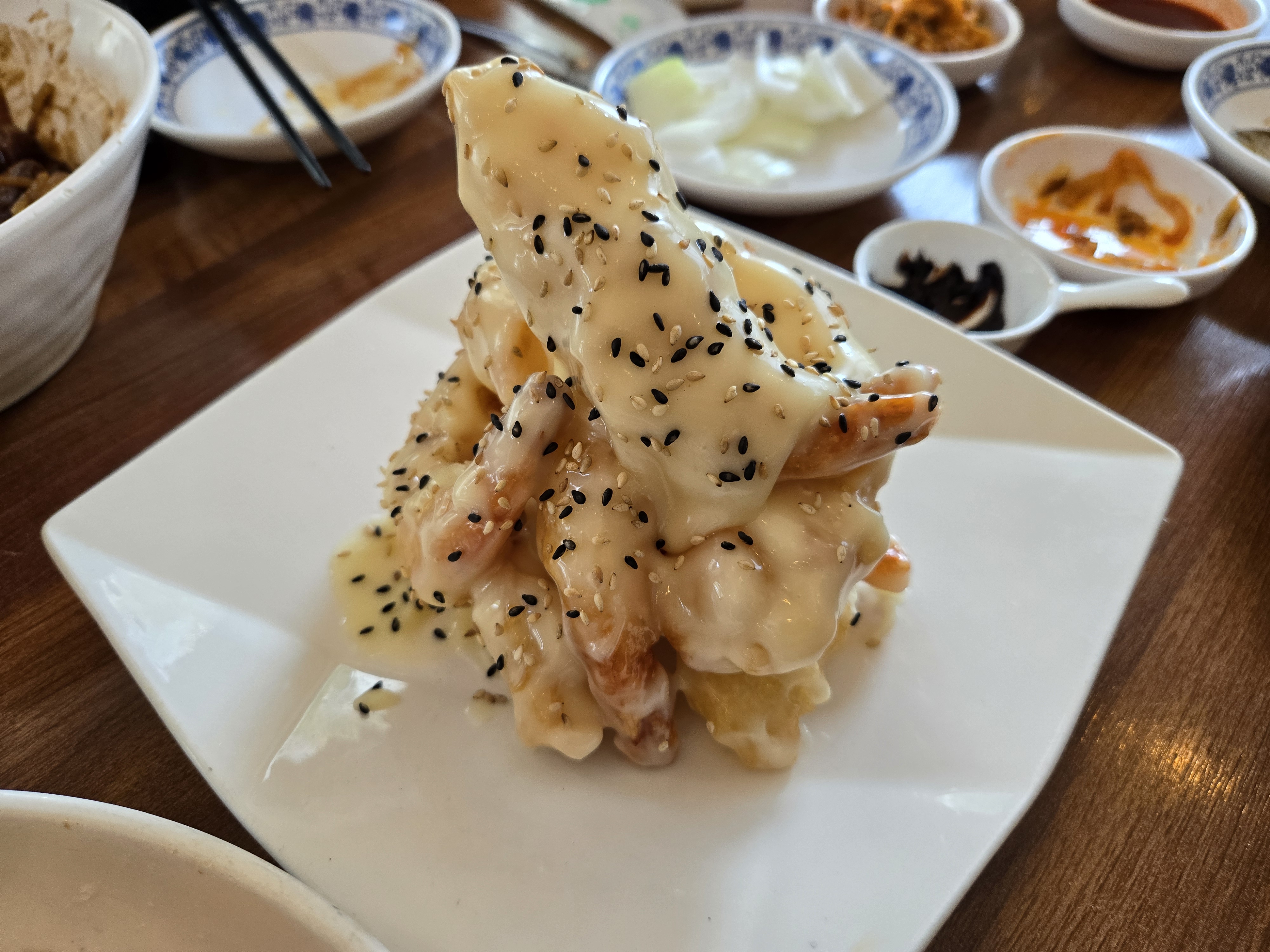 새콤달콤한 소스와 바삭한 마늘푸레이크를 아낌없이 뿌린 요리였습니다.