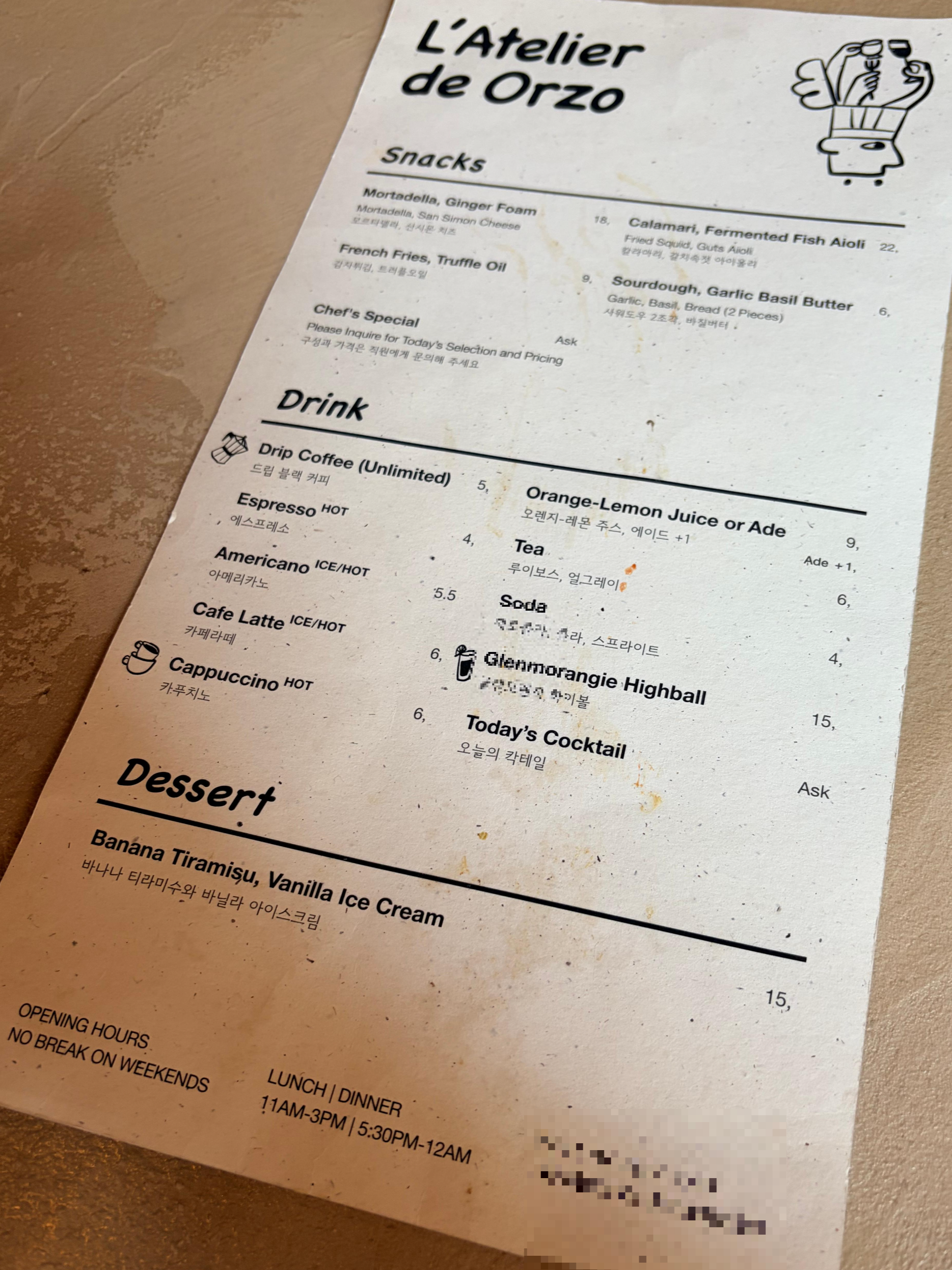 한남동 맛집 라틀리에드오르조의 메뉴판입니다.