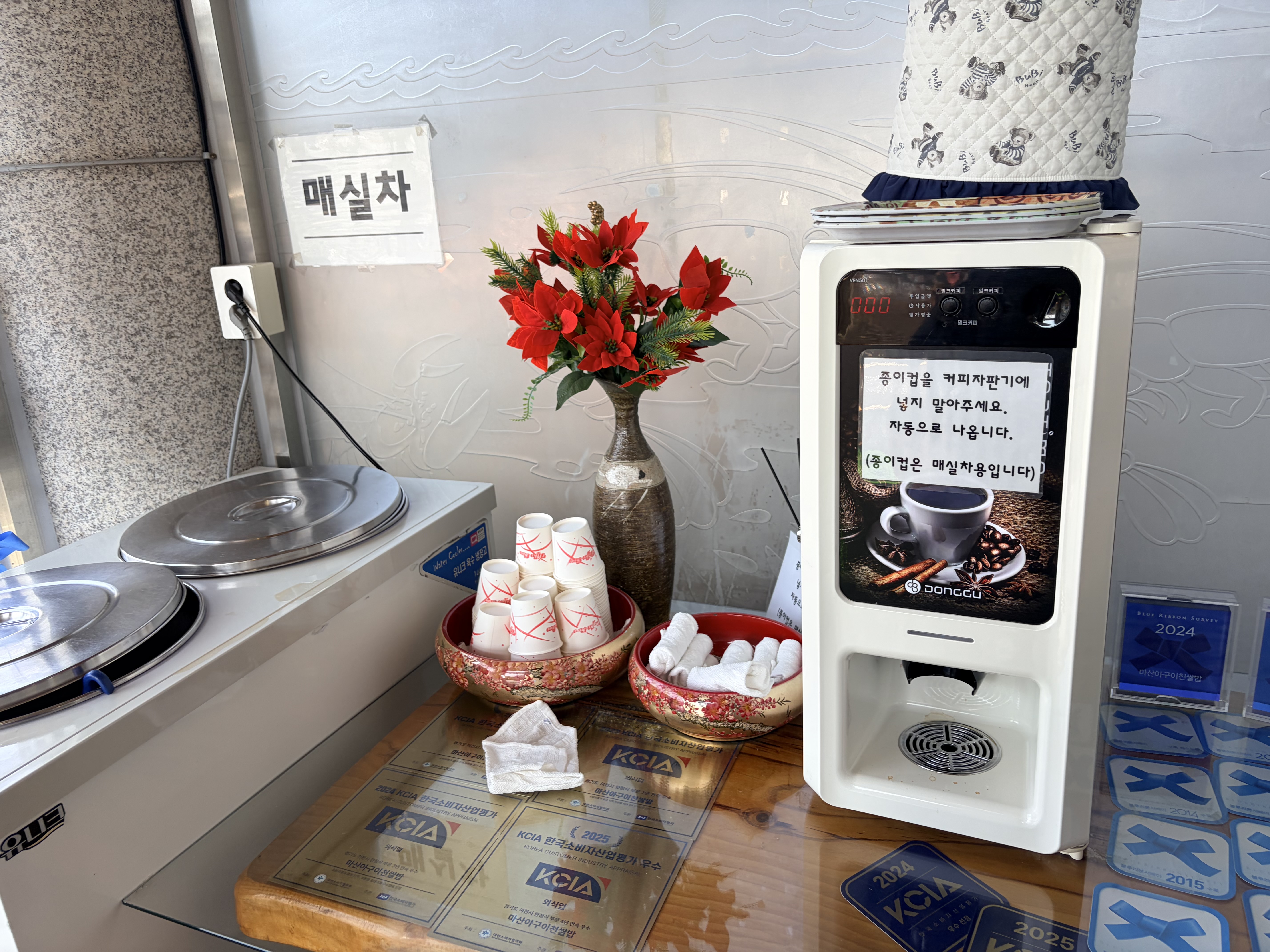 덕평 마산아구 이천쌀밥집 입구에는 매실차와 커피도 준비되어 있습니다.