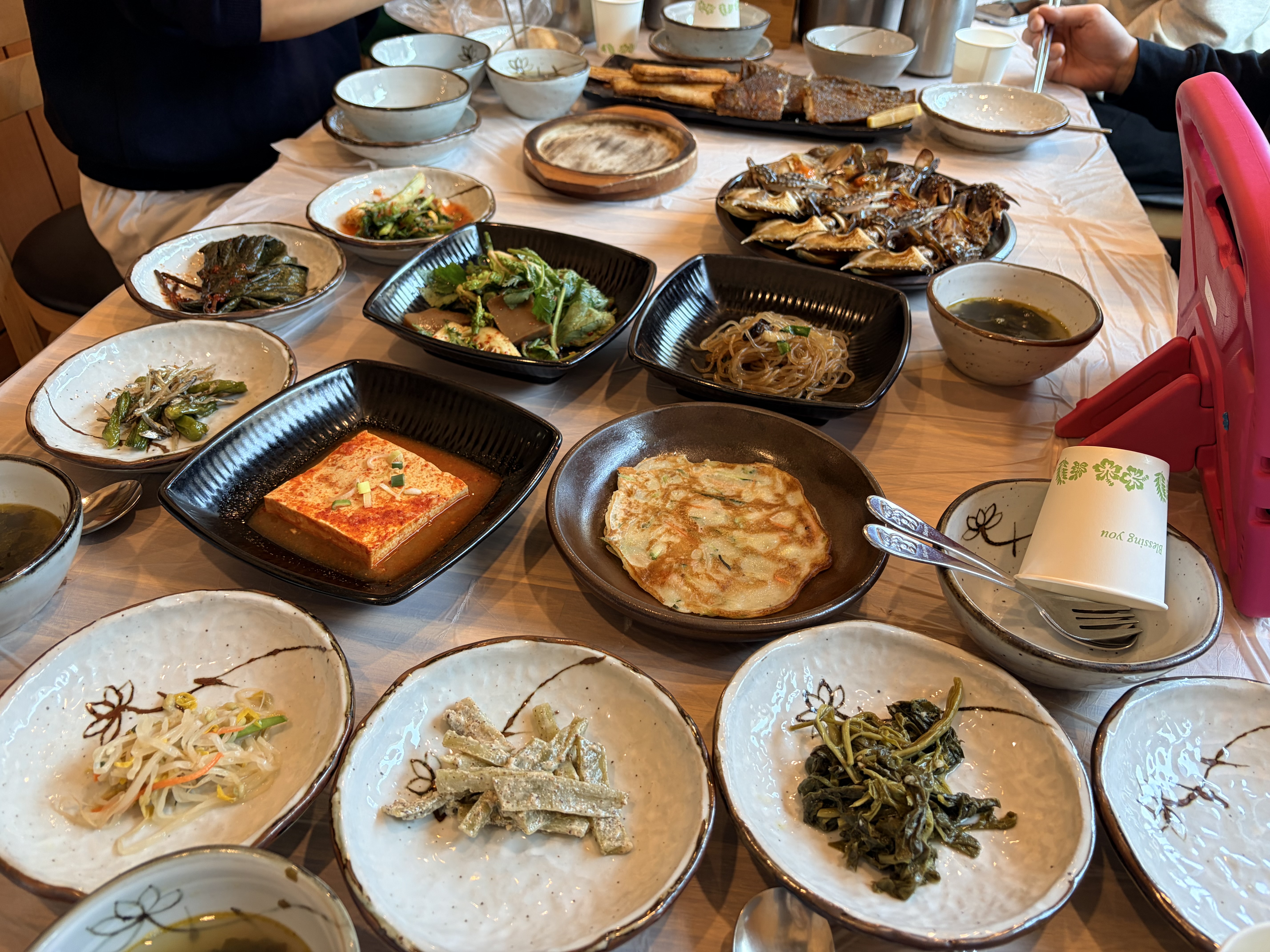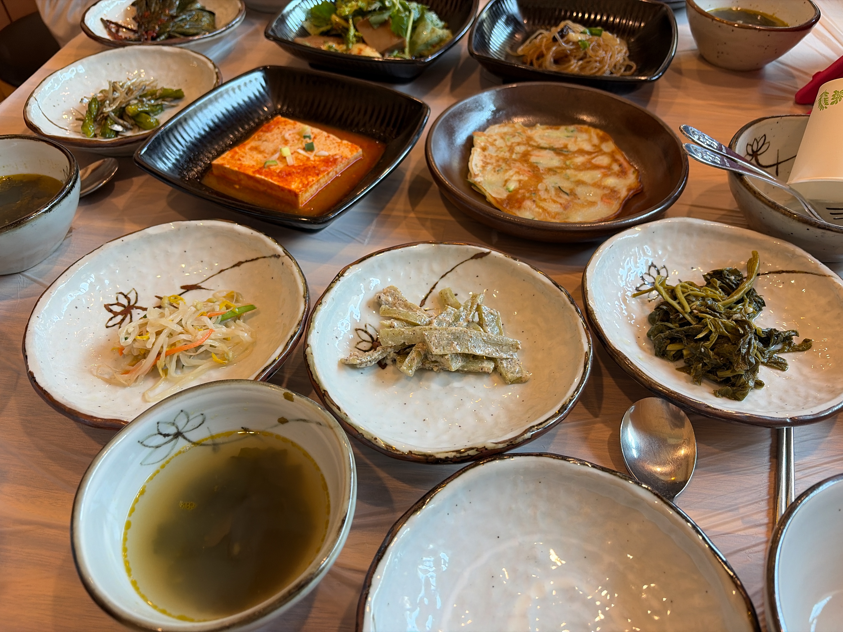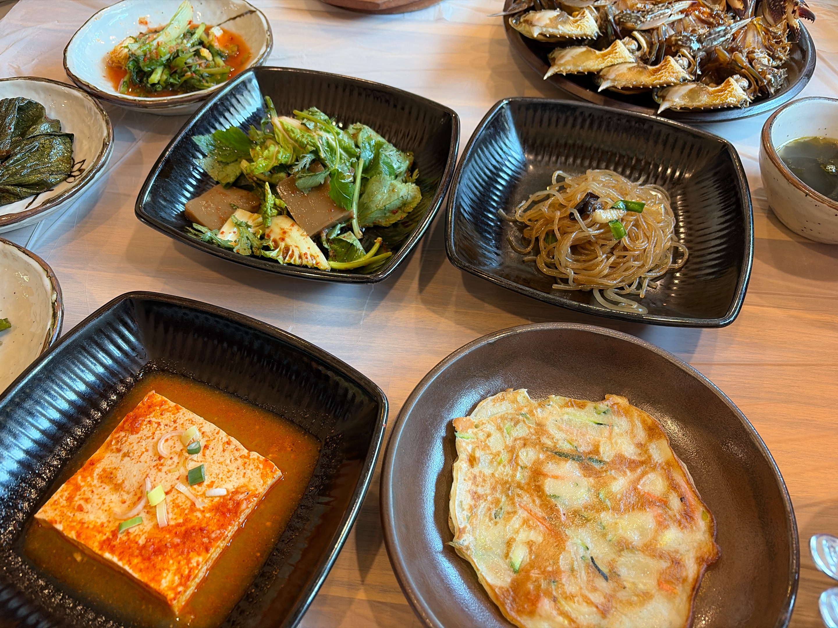다양한 나물 반찬과 두부조림, 부침개, 잡채, 도토리묵, 생선구이 그리고 간장게장에 미역국 등등 나옵니다.