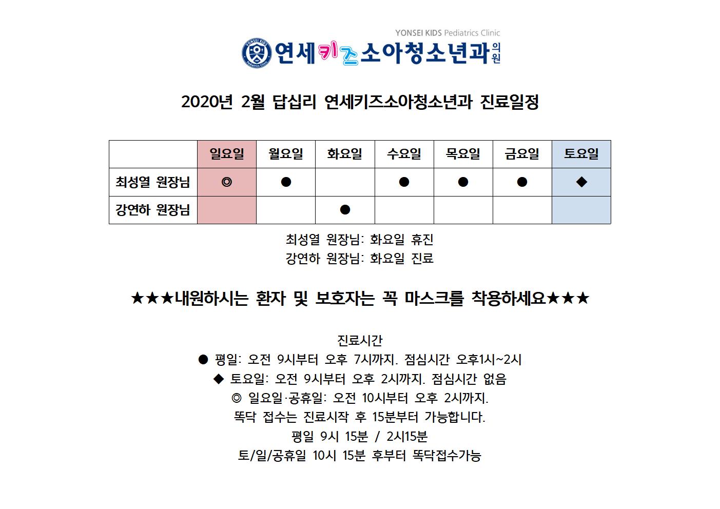 2020년 2월 답십리 연세키즈소아청소년과 진료일정