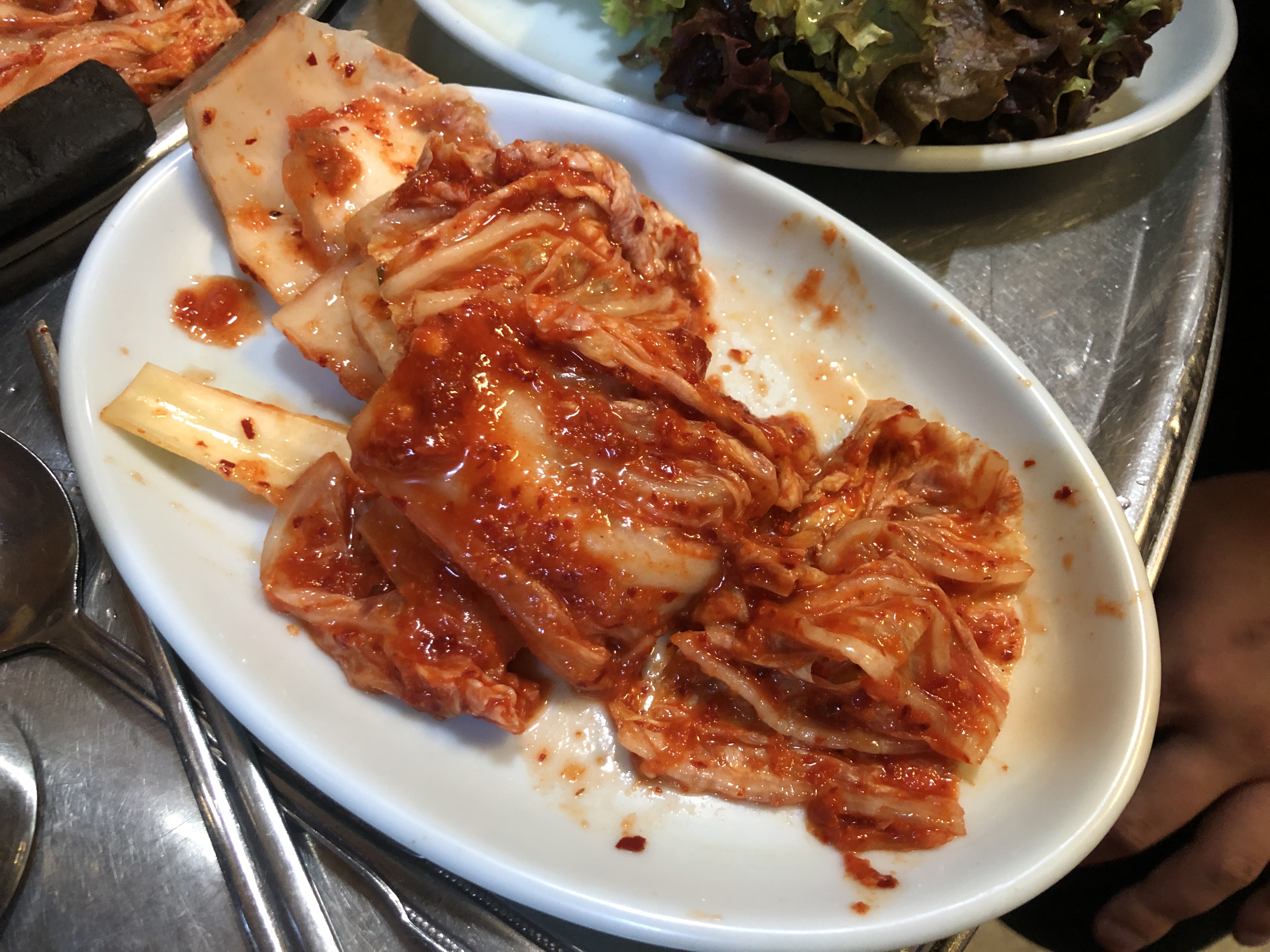 잘 달궈진 연탄불판 위에 부위별 고기를 올리고 김치도 함께 올려서 구워봅니다.