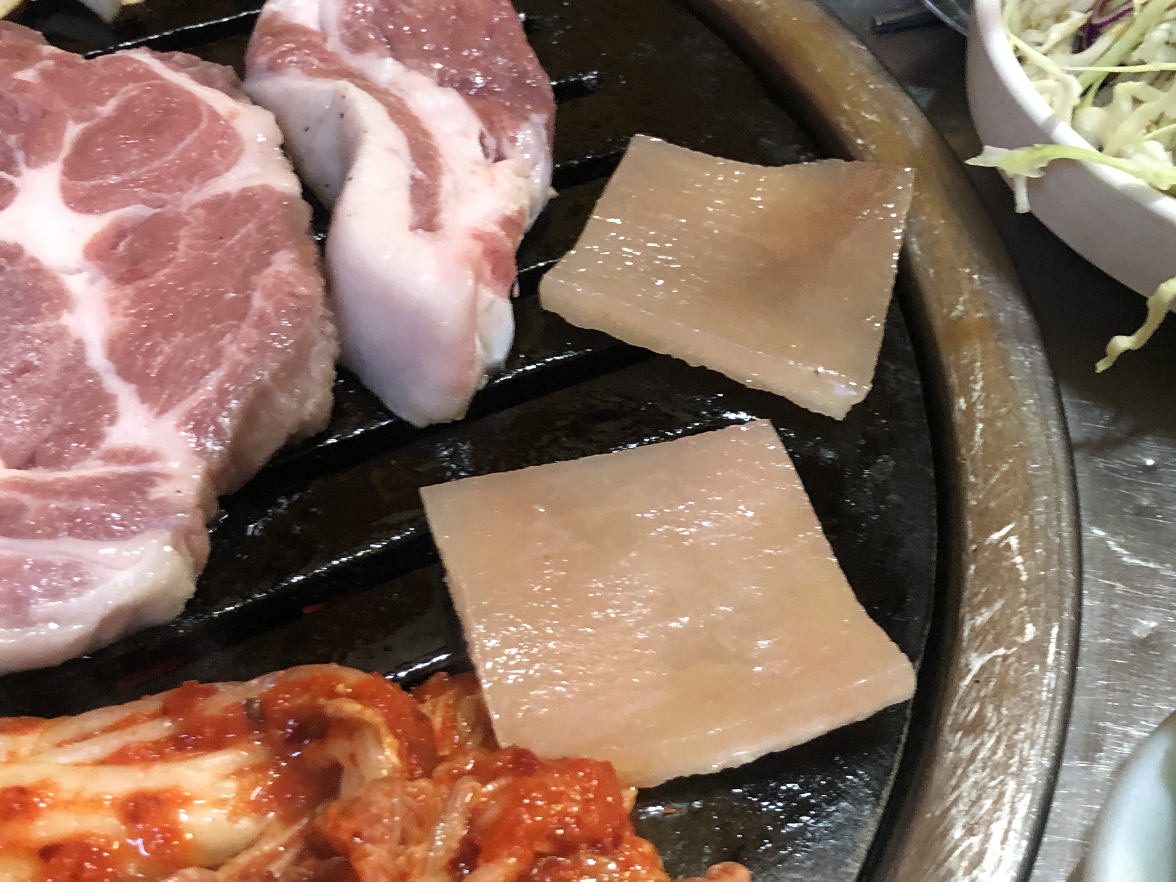 모듬에는 돼지껍데기도 함께 제공되는데 구울때 튈 수 있으니 조심히 구워줍니다.