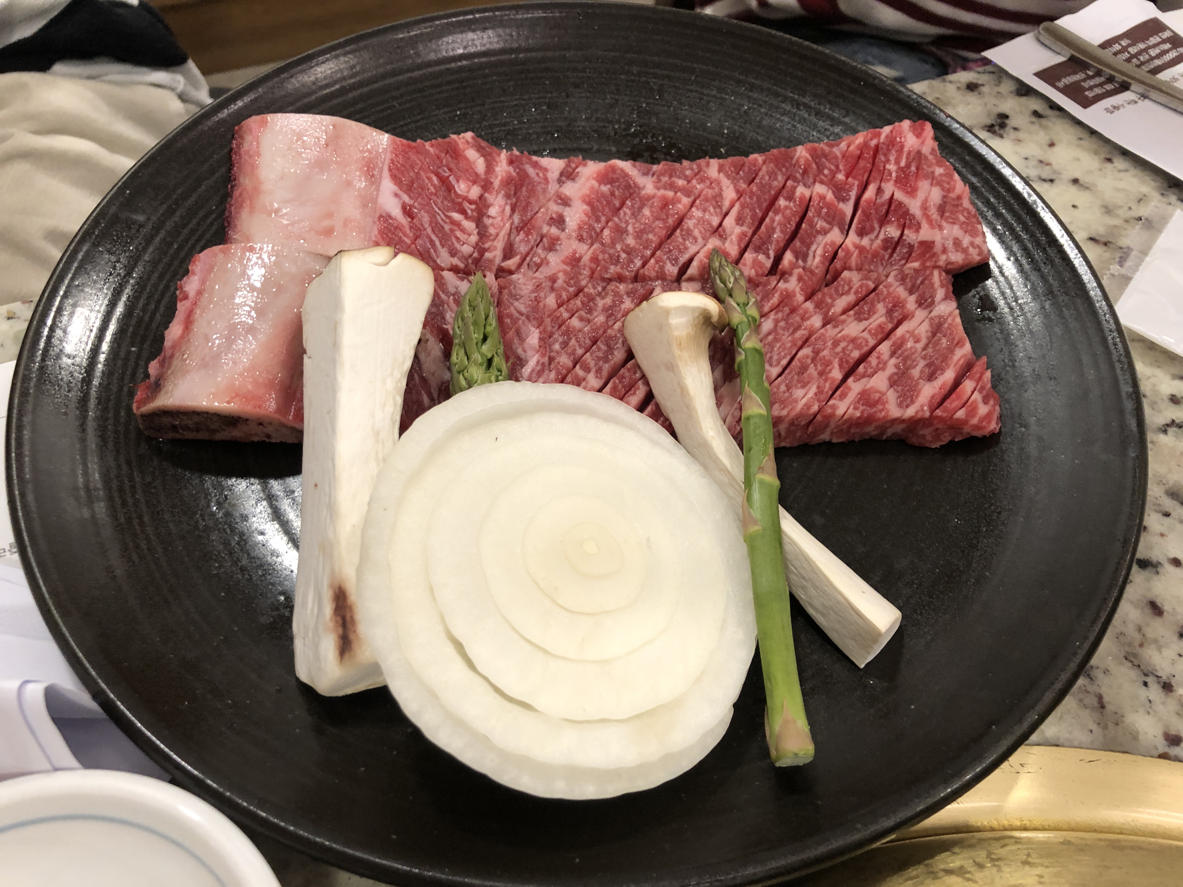 양파와 새송이버섯, 아스파라거스가 곁들여져서 나옵니다.