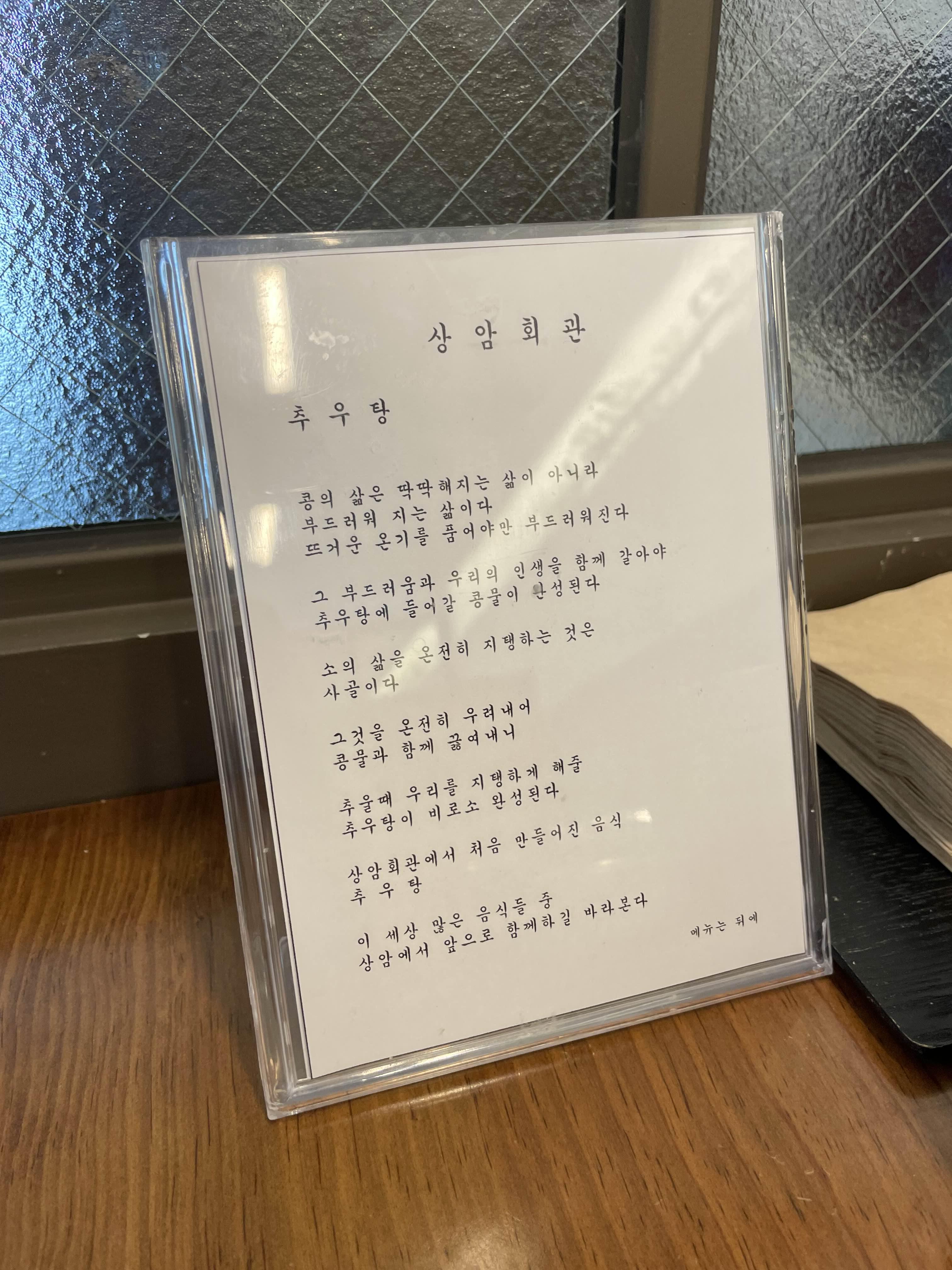 제가 방문했을 때는 여름메뉴인 냉콩국수가 남아있었는데 아마 지금은 추우탕만 판매하고 있을 듯 하네요~