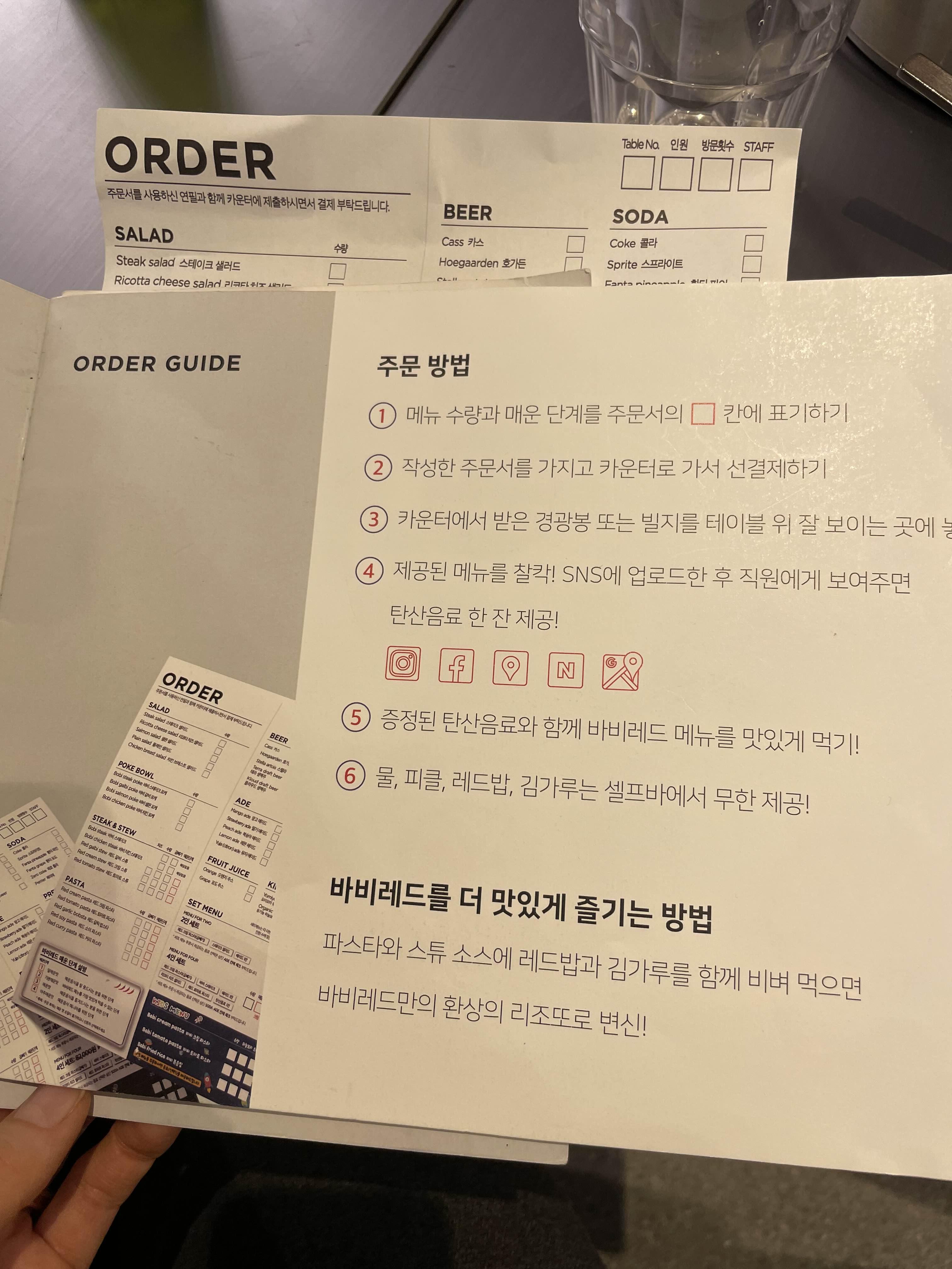 매운갈비파스타 맛집 바비레드의 주문 방법은 메뉴판에서 메뉴를 정하고, 주문서 작성 후 선결제하면 됩니다.