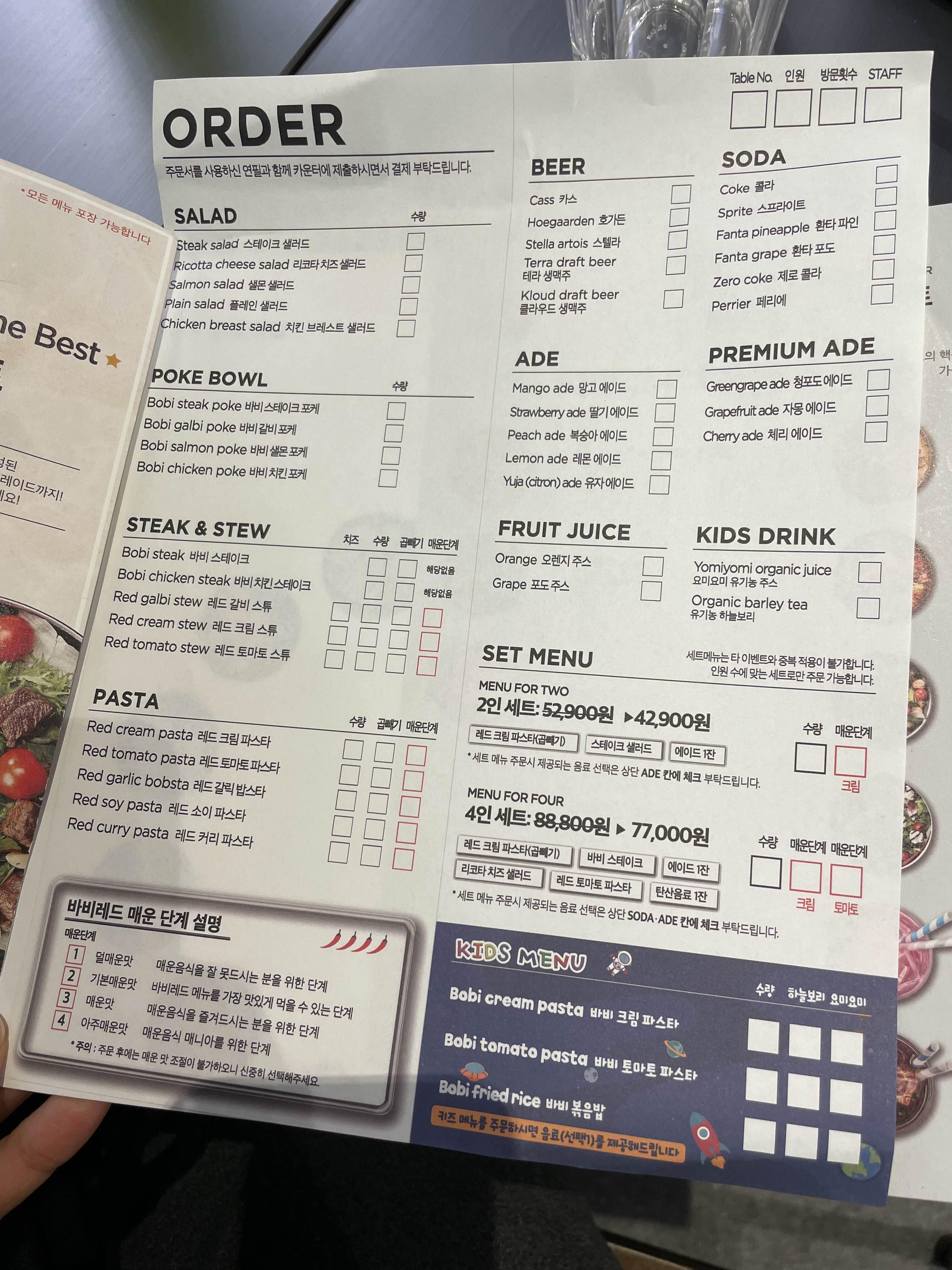 열심히 바비레드의 메뉴 공부를 한 후 주문서에 체크하고 카운터에서 결제를 하면 됩니다~