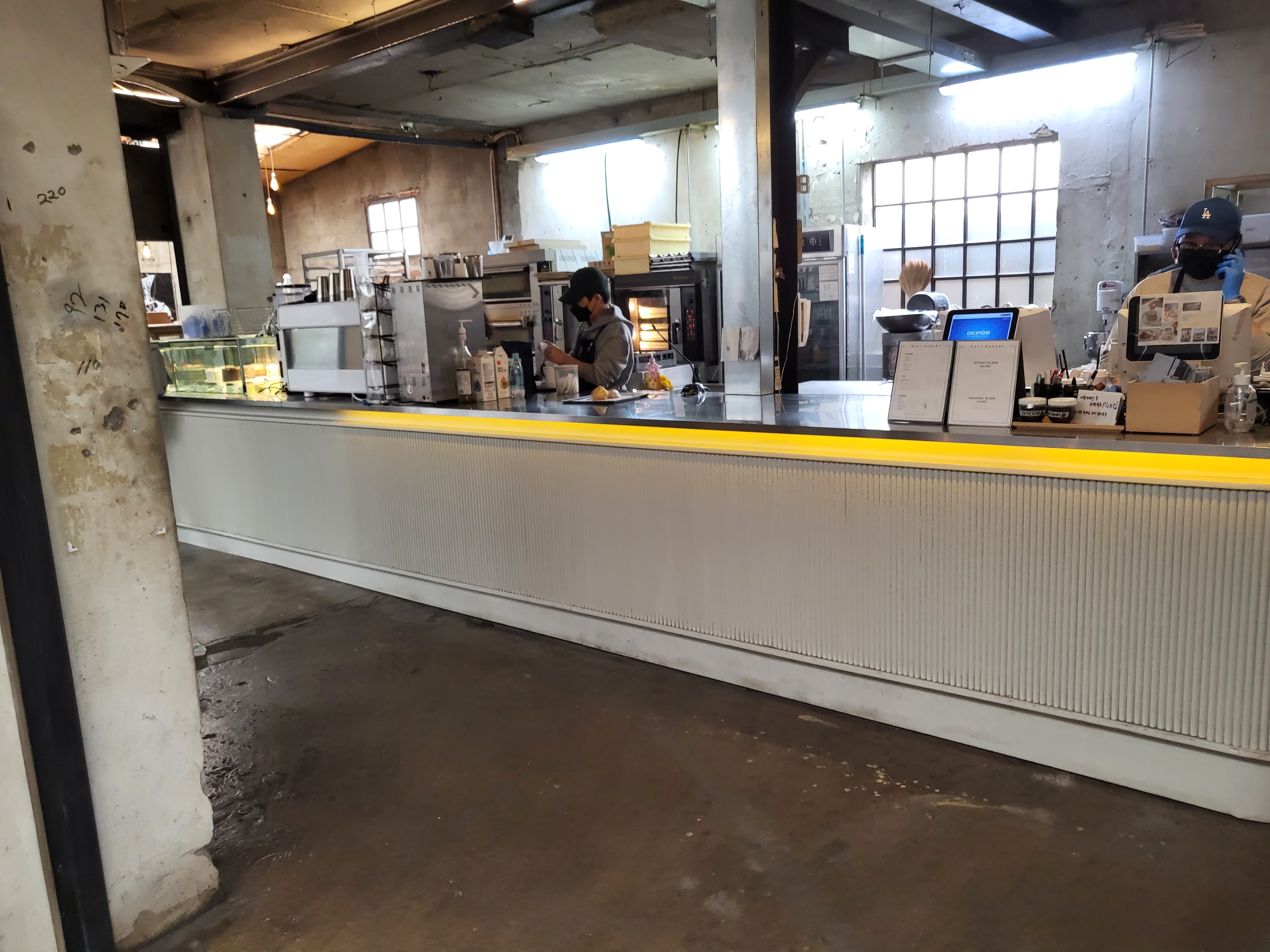 공장 느낌을 살린 특색있는 문래역 러스트 베이커리의 인테리어입니다.