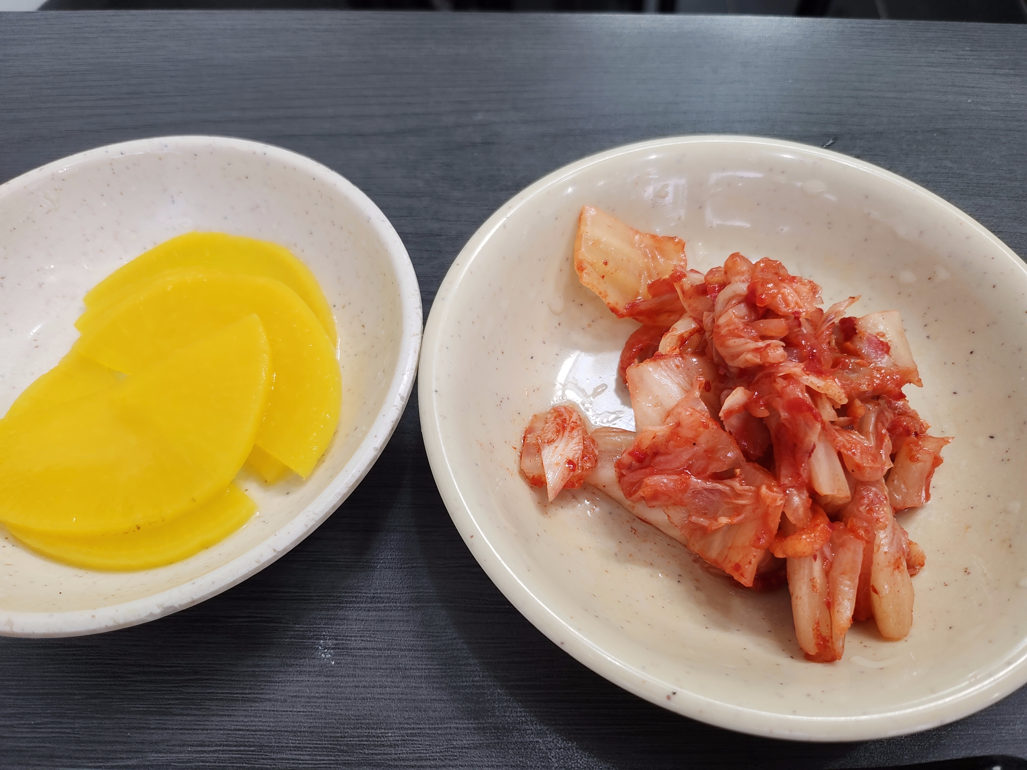 신촌 분식집 바지락수제비칼국수의 반찬은 단무지와 김치 두가지입니다.