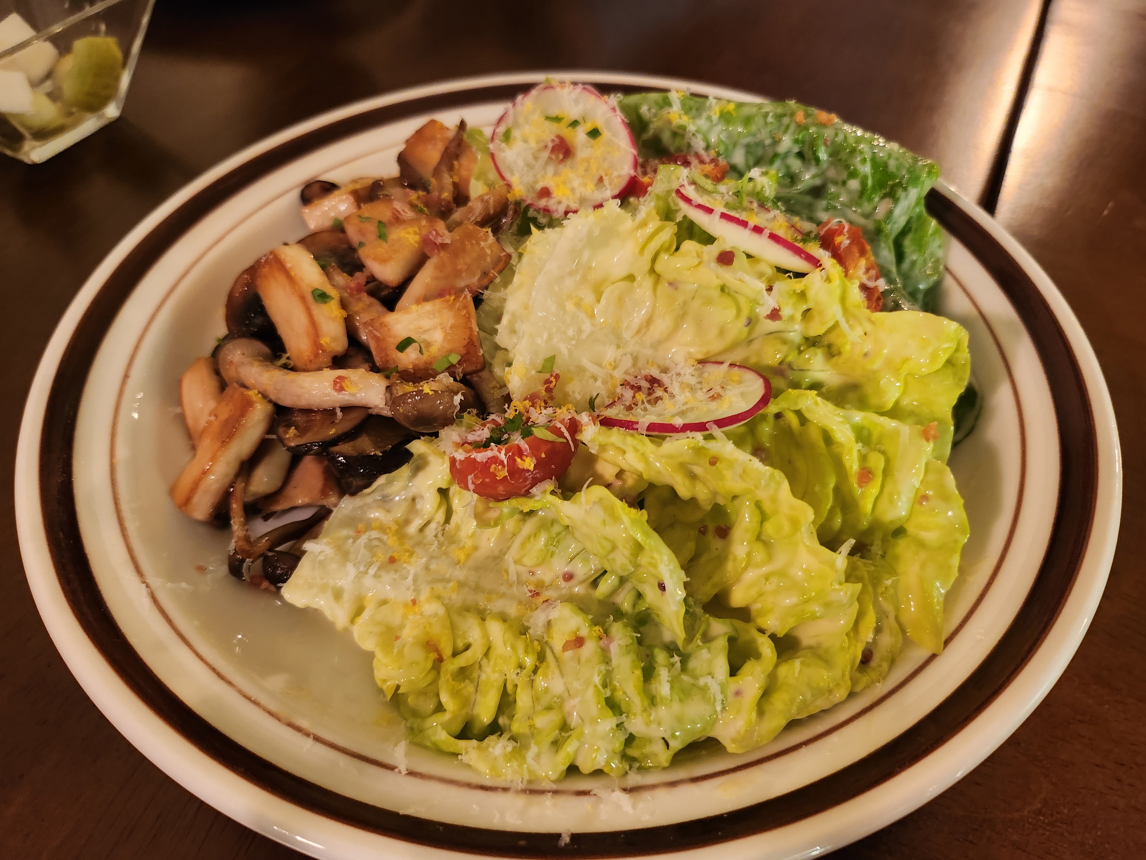 야채가 신선하고 구운 버섯의 풍미가 시저 드레싱과 잘 어울리는 샐러드였습니다!