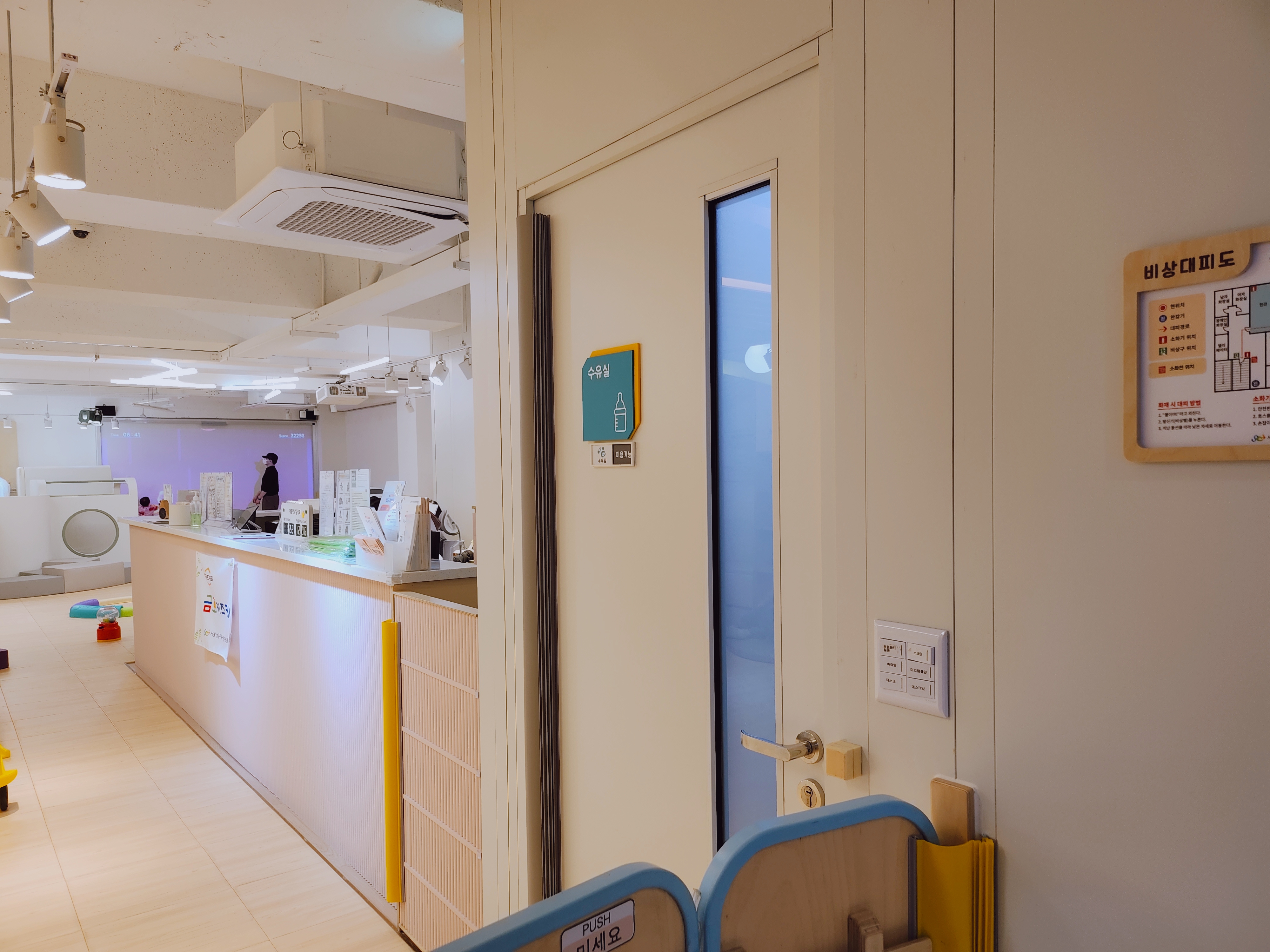 입구에는 유모차 주차공간이 있고, 수유실도 마련되어 있습니다.
