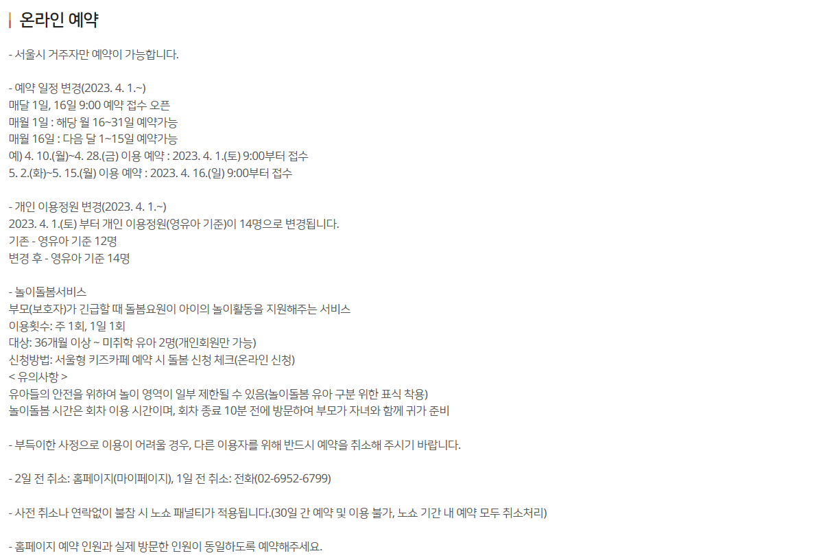 •예약사이트: https://icare.seoul.go.kr/icare/user/kidsCafe/BD_selectKidsCafeView.do?q_fcltyId=SD221201
