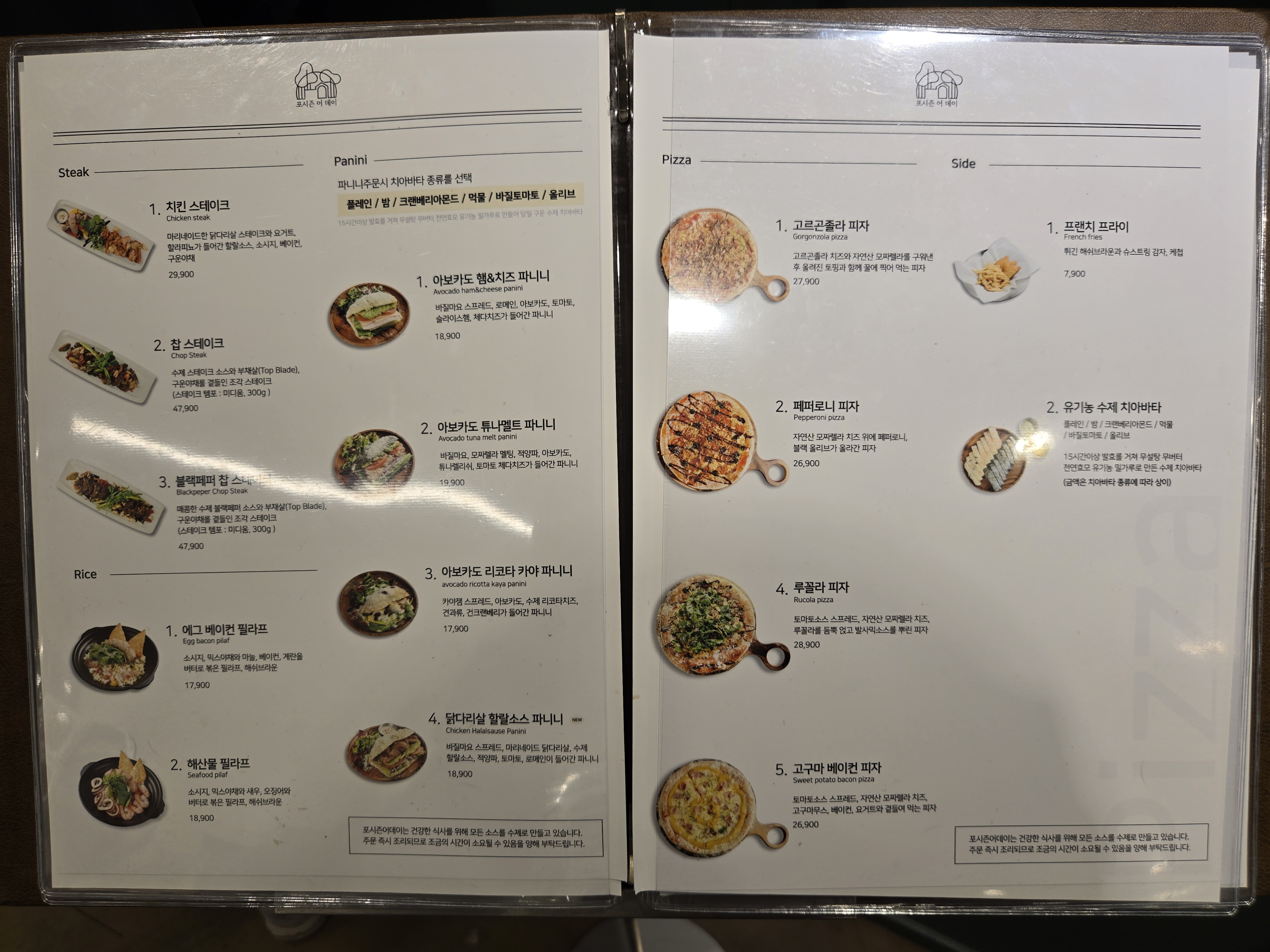 스테이크, 라이스,파니니, 피자, 사이드 메뉴가 준비되어 있었습니다.