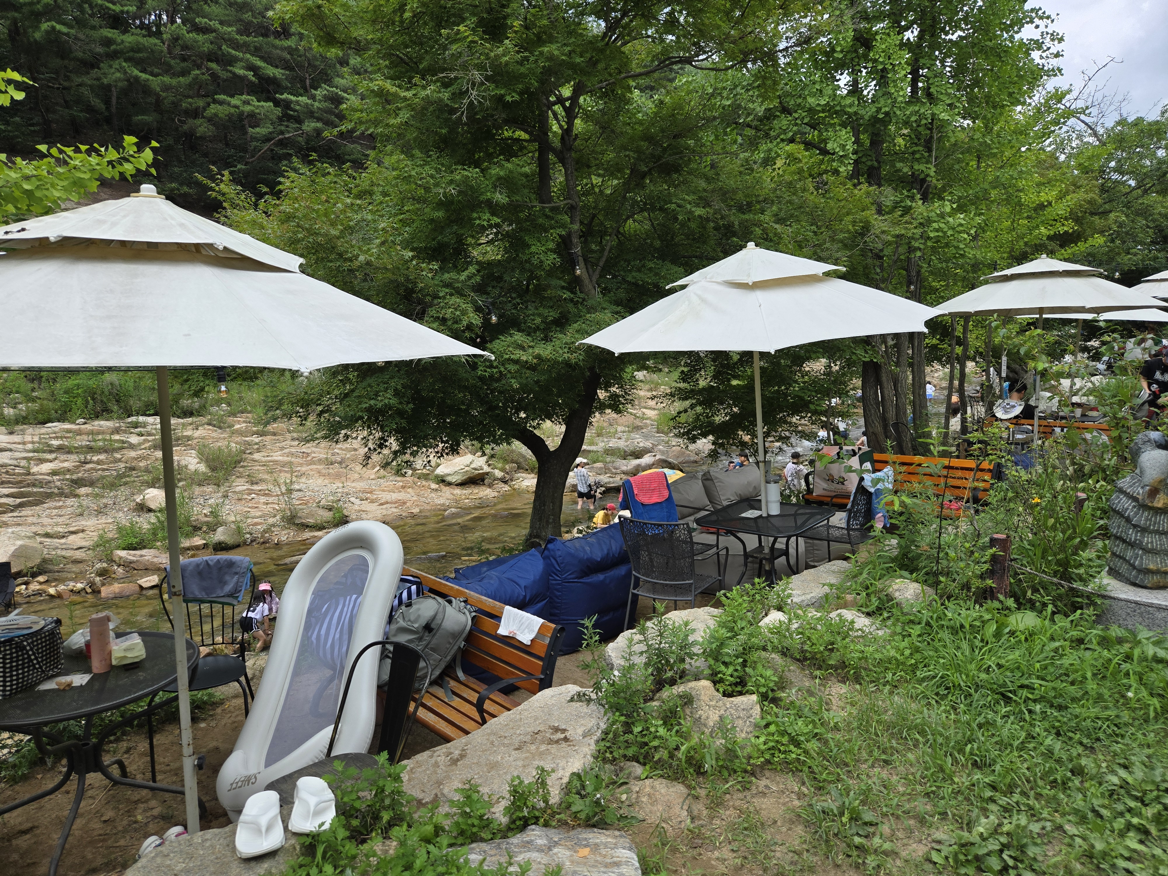 계곡 근처에 있는 야외 자리는 뷰도 좋고 물소리 듣기에도 좋을 듯 합니다.