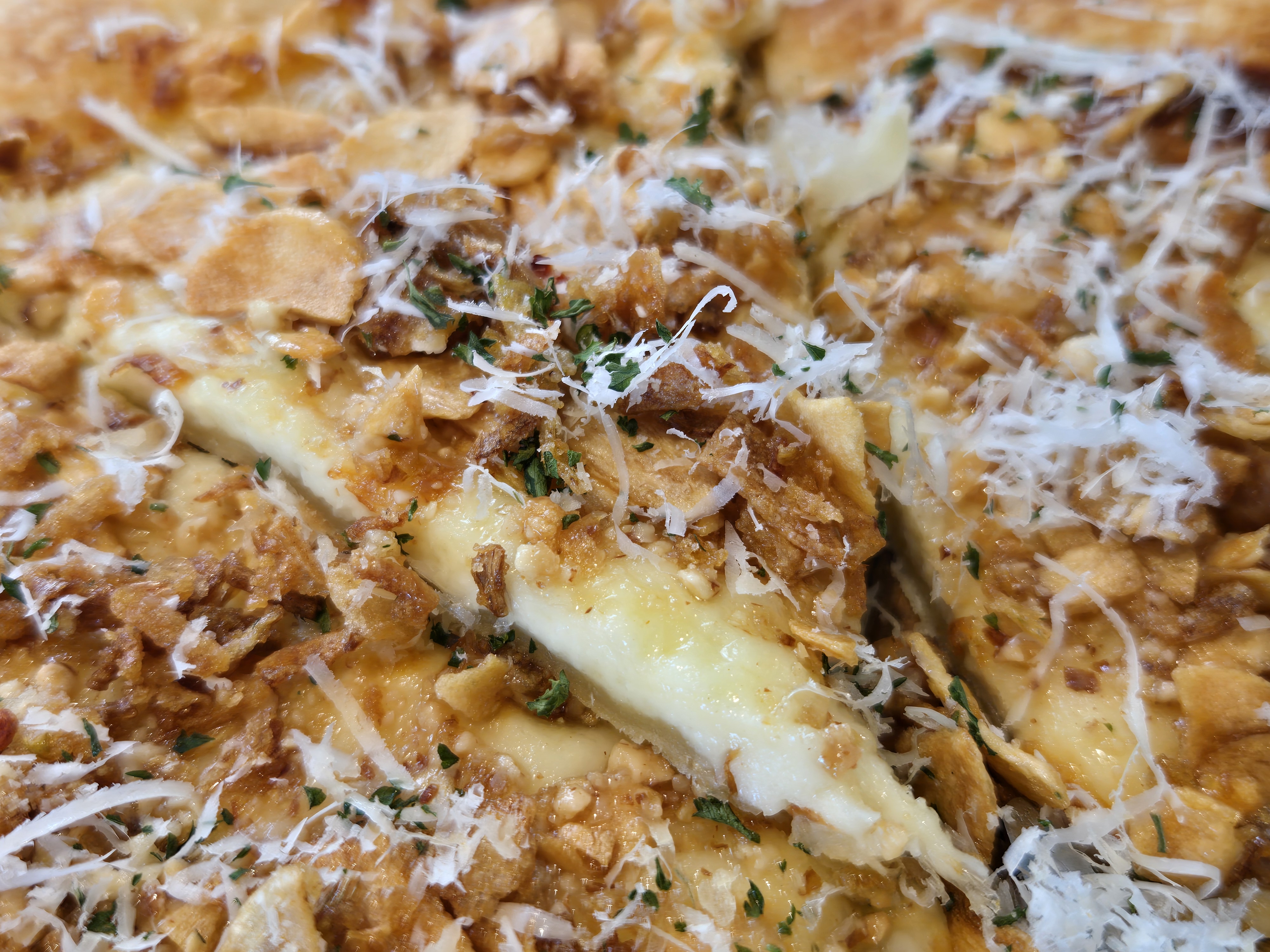 고르곤졸라피자는 크리스피한 마늘과 아몬드 그리고