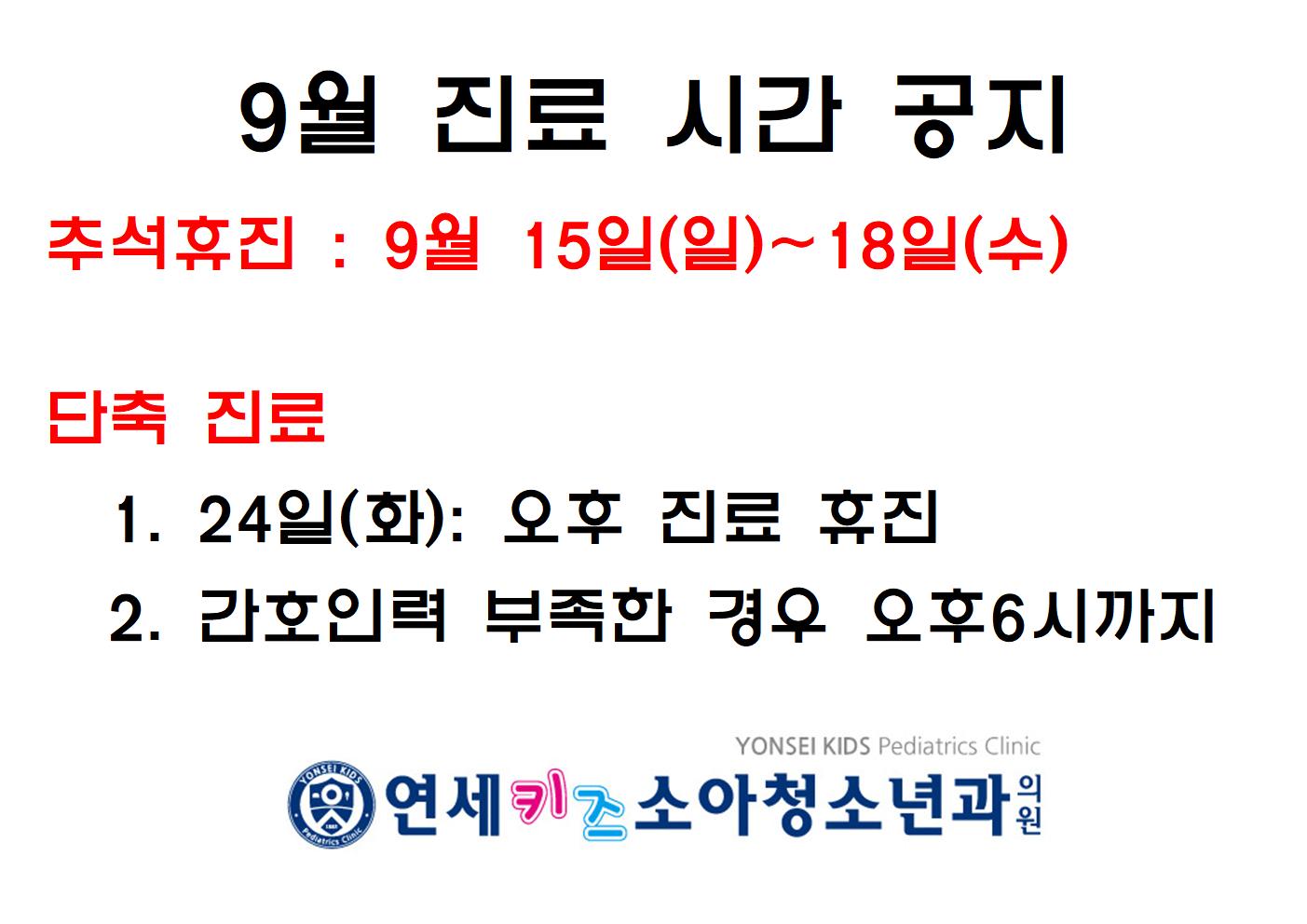 추석연휴 휴진 및 단축진료 일정이 있어 공지합니다.