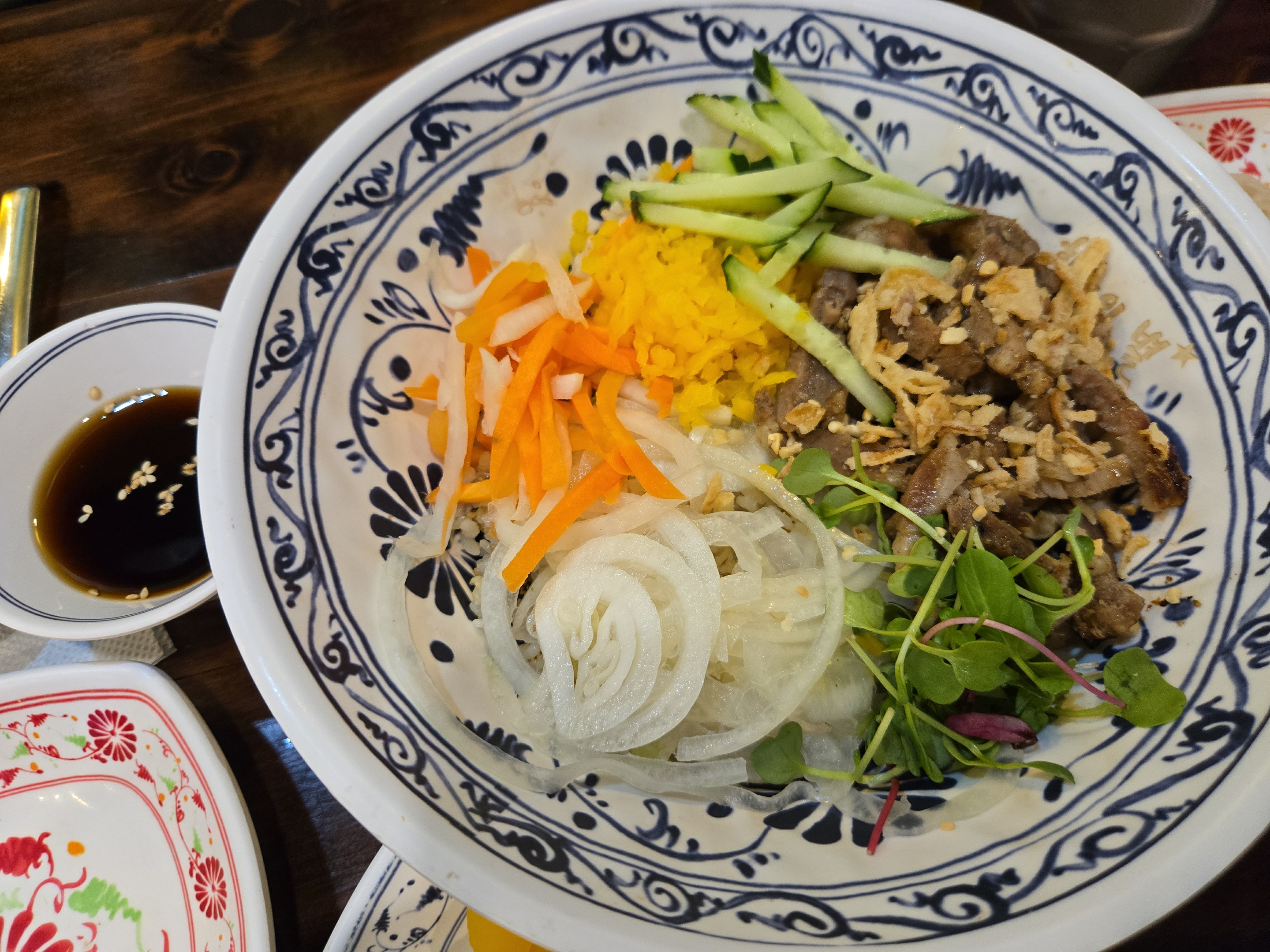 신선한 야채와 참숯으로 구운 돼지고기가 올라가고 특제 간장 소스같은 것을 뿌려 먹는 덮밥인데요~우리나라 비빔밥과는 느낌이 다르지만 하노이 별 덮밥만의 매력이 있는 듯 합니다.
