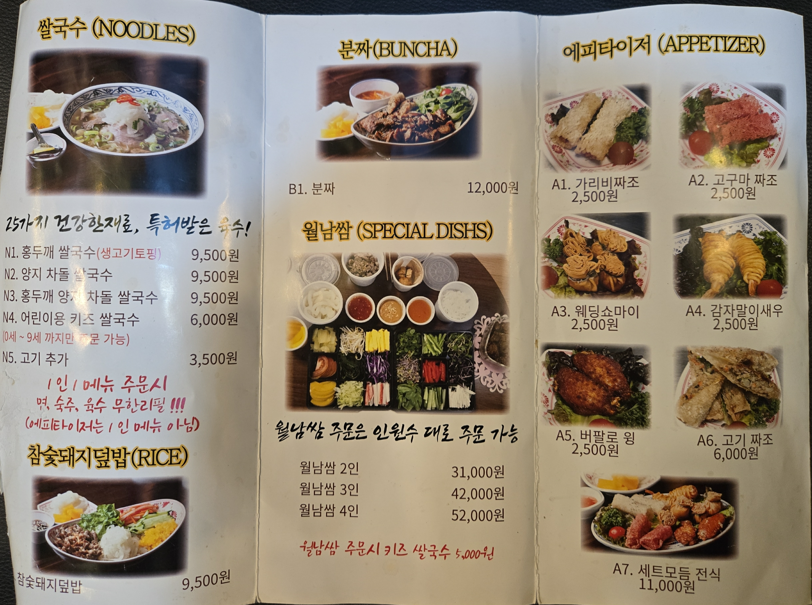 1인 1메뉴 주문시 면, 숙주, 육수가 무한리필 되는 하노이 별 메뉴판입니다.