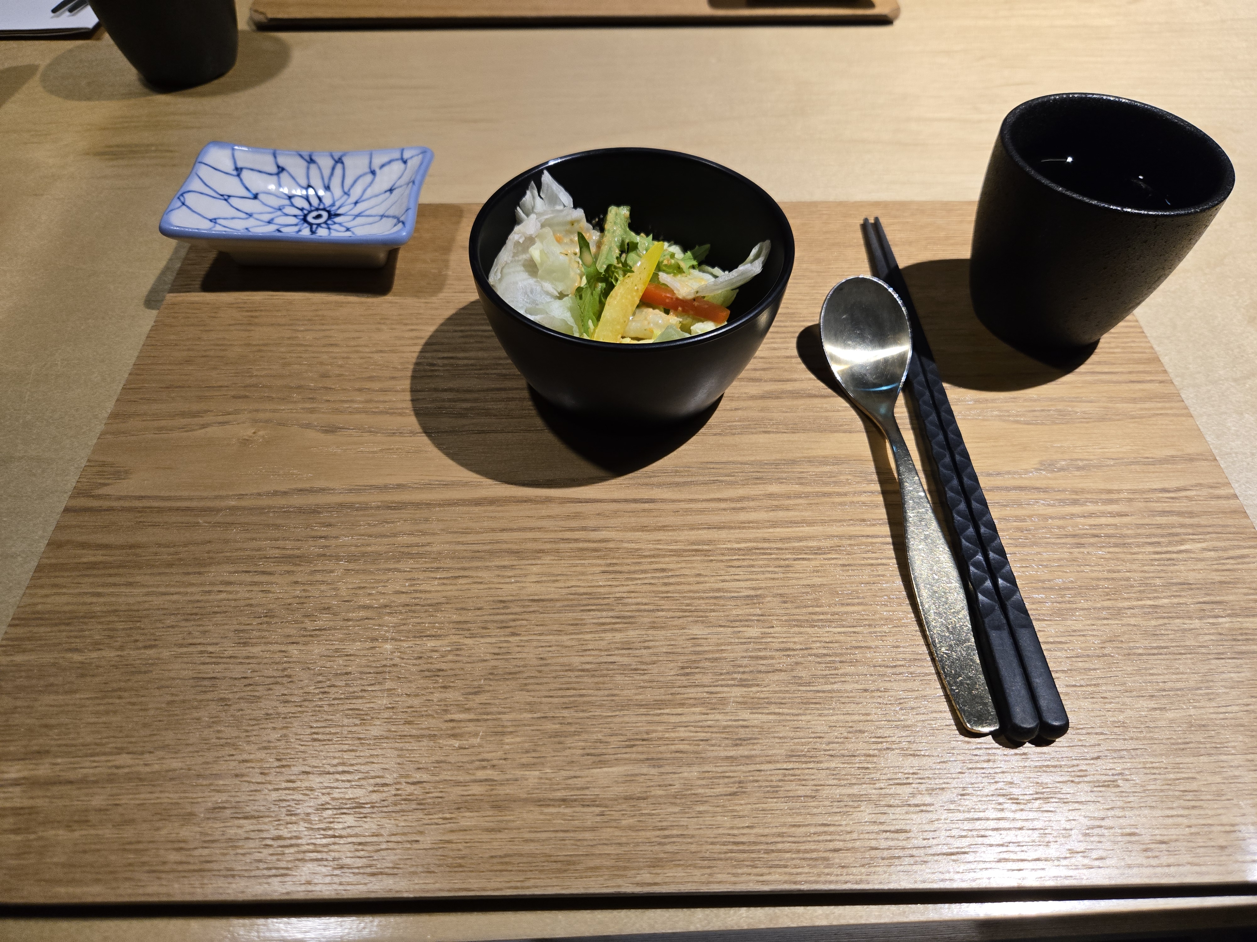기본적으로 신선한 야채샐러드가 셋팅이 되고, 단무지와 오이지 락교가 기본반찬으로 나옵니다.