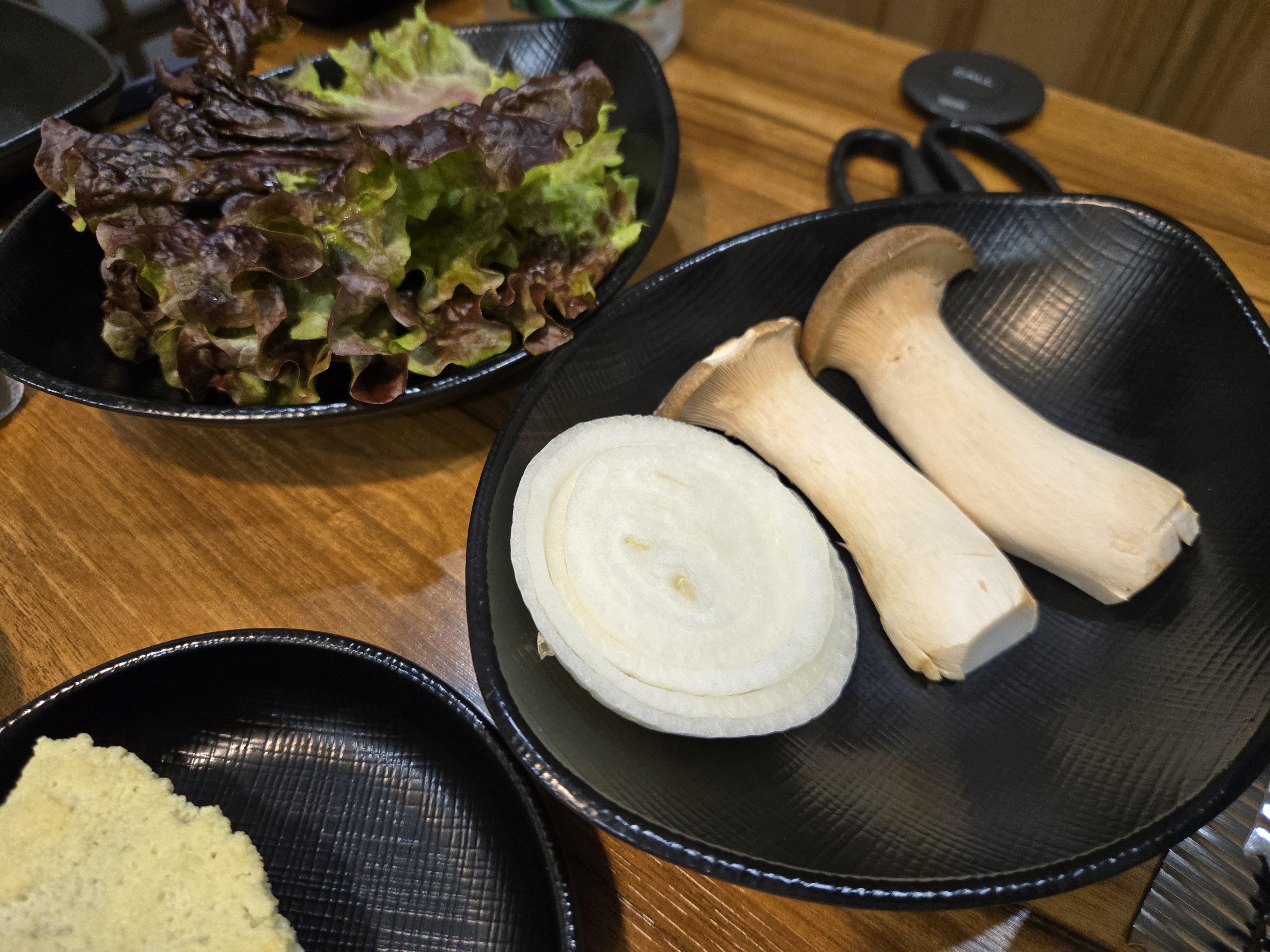 더덕무침 같은 반찬과 계란찜 그리고 고기에 곁들여 구울 양파와 버섯, 상추쌈과 마늘 쌈장 이렇게였습니다.