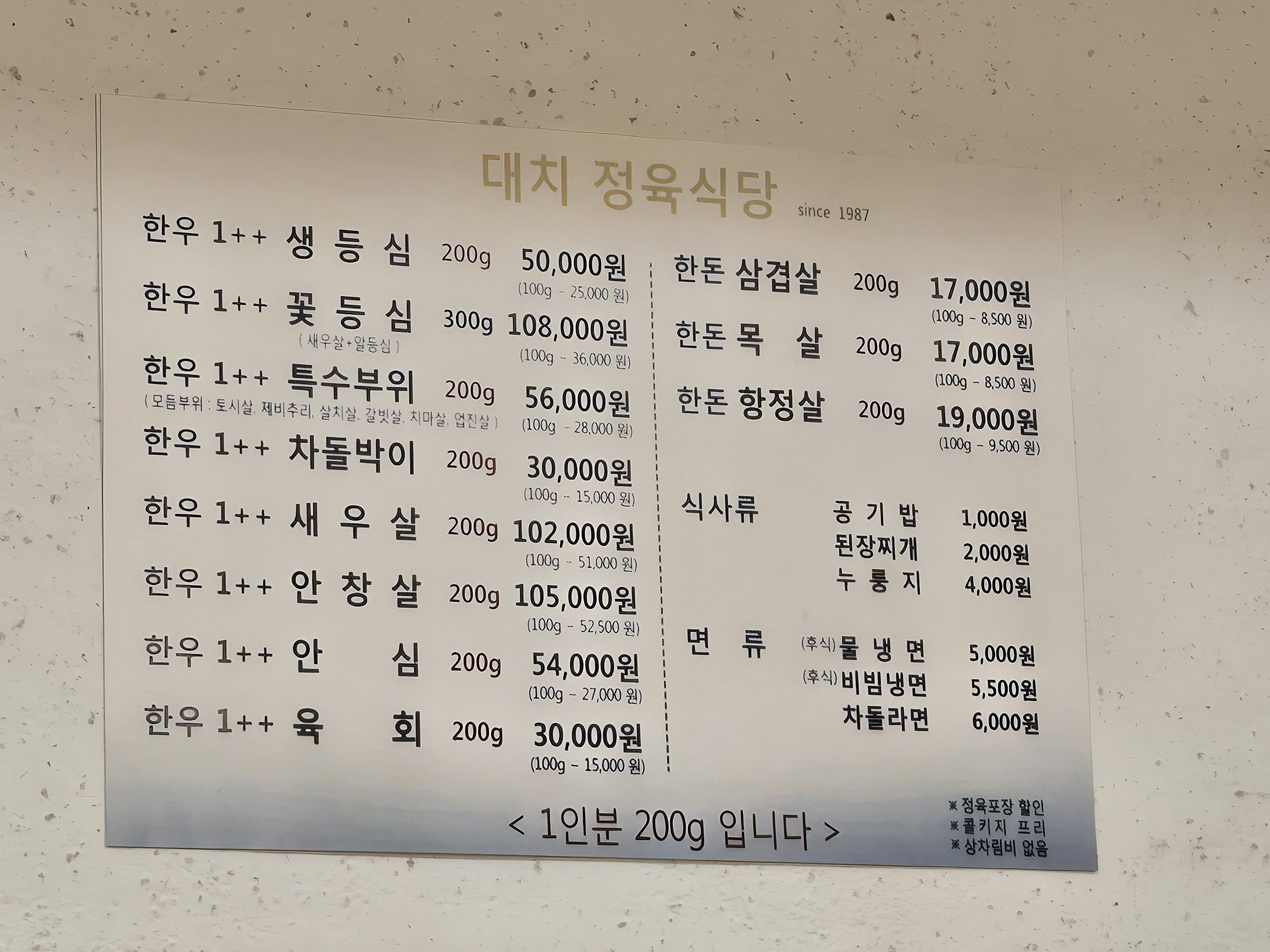 1인분이 200g이고 콜키지프리에 상차림비도 없어서 비교적 저렴하게 품질좋은 소고기와 돼지고기 식사를 할 수 있었습니다.