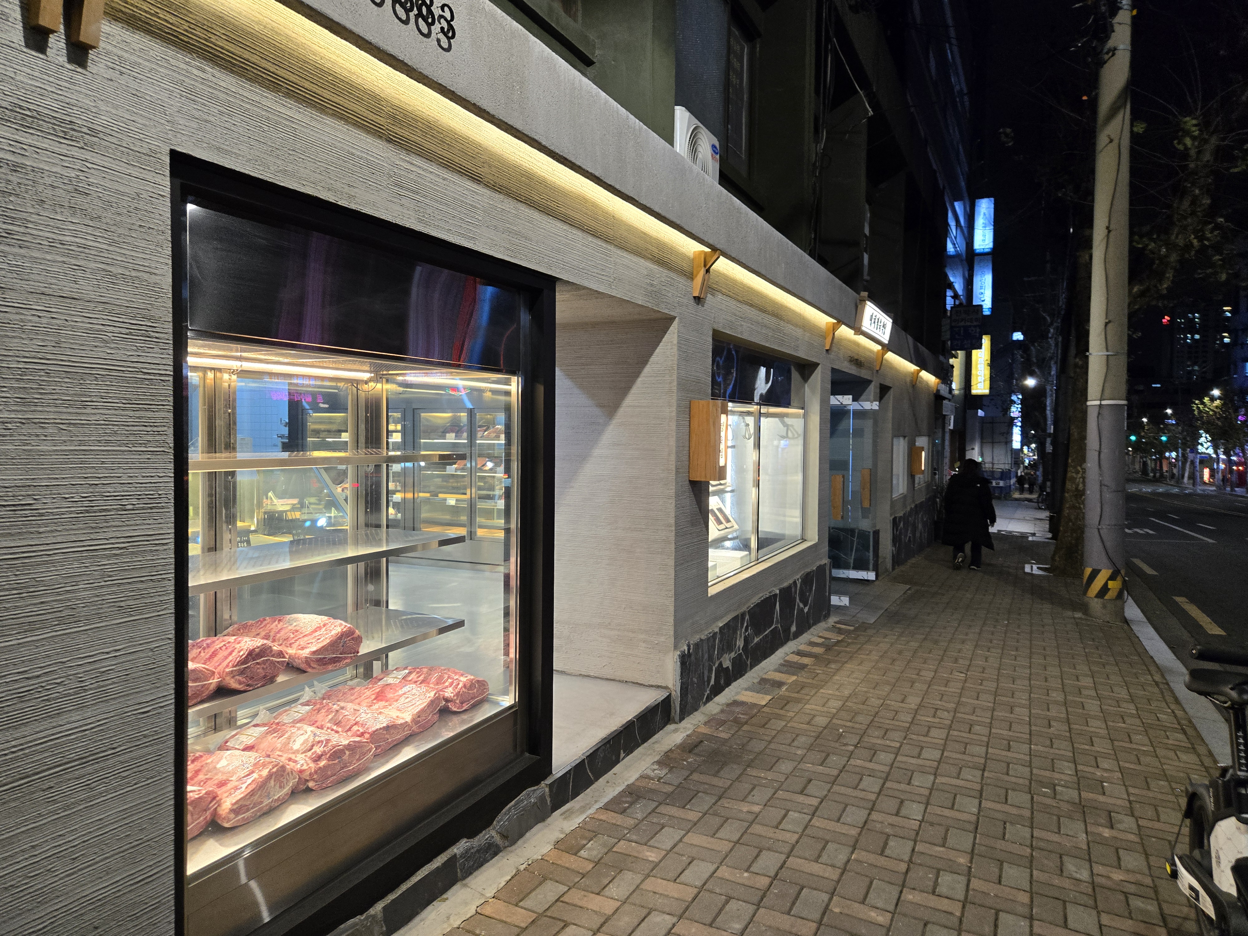 길가에서 보이는 냉장고에는 진공포장된 한우 소고기가 진열되어 있었습니다.