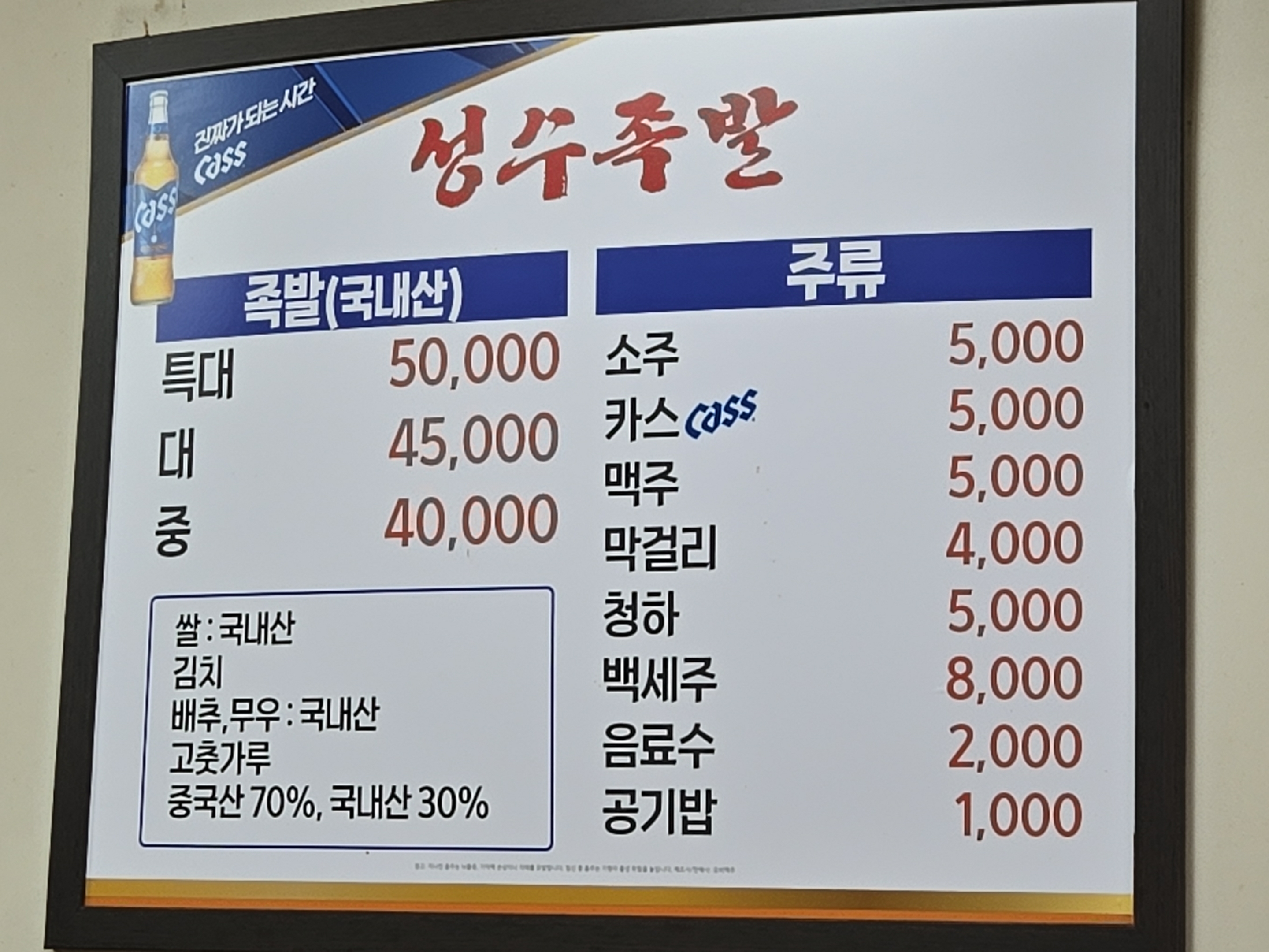 서울의 3대 족발이라고 하는 성수족발의 메뉴판입니다.