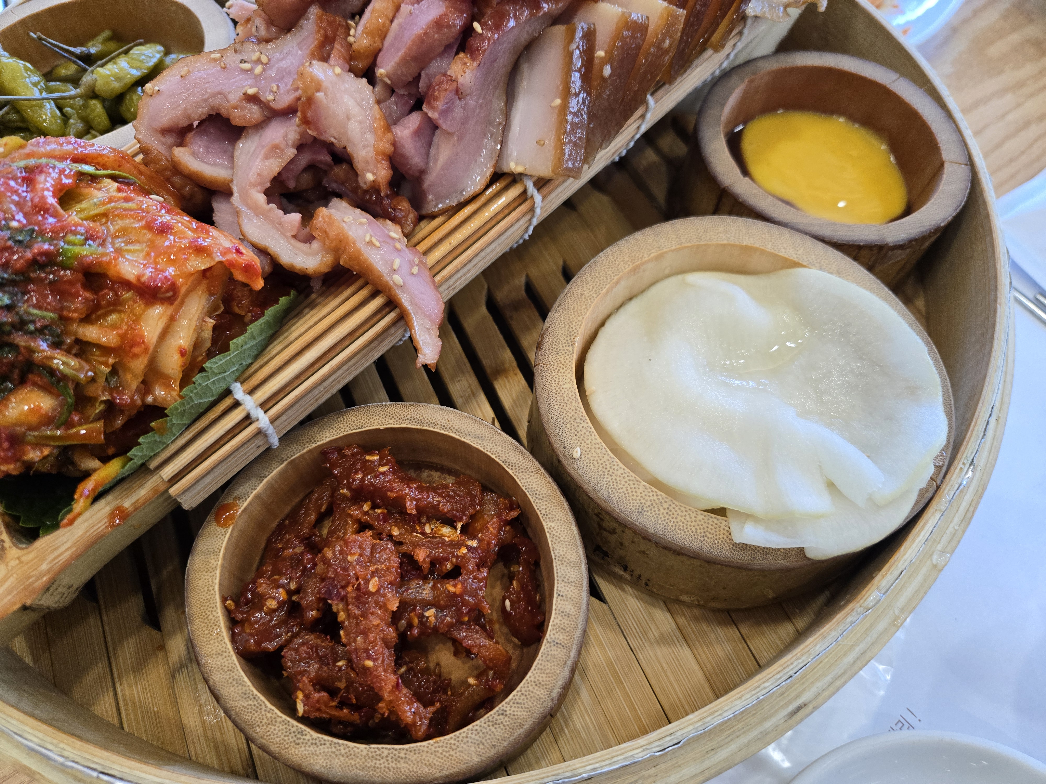 보쌈용김치와 쌈무, 소스, 고추장아찌, 마늘 고추, 황태무침과 같은 다양한 반찬들이 함께 나옵니다.