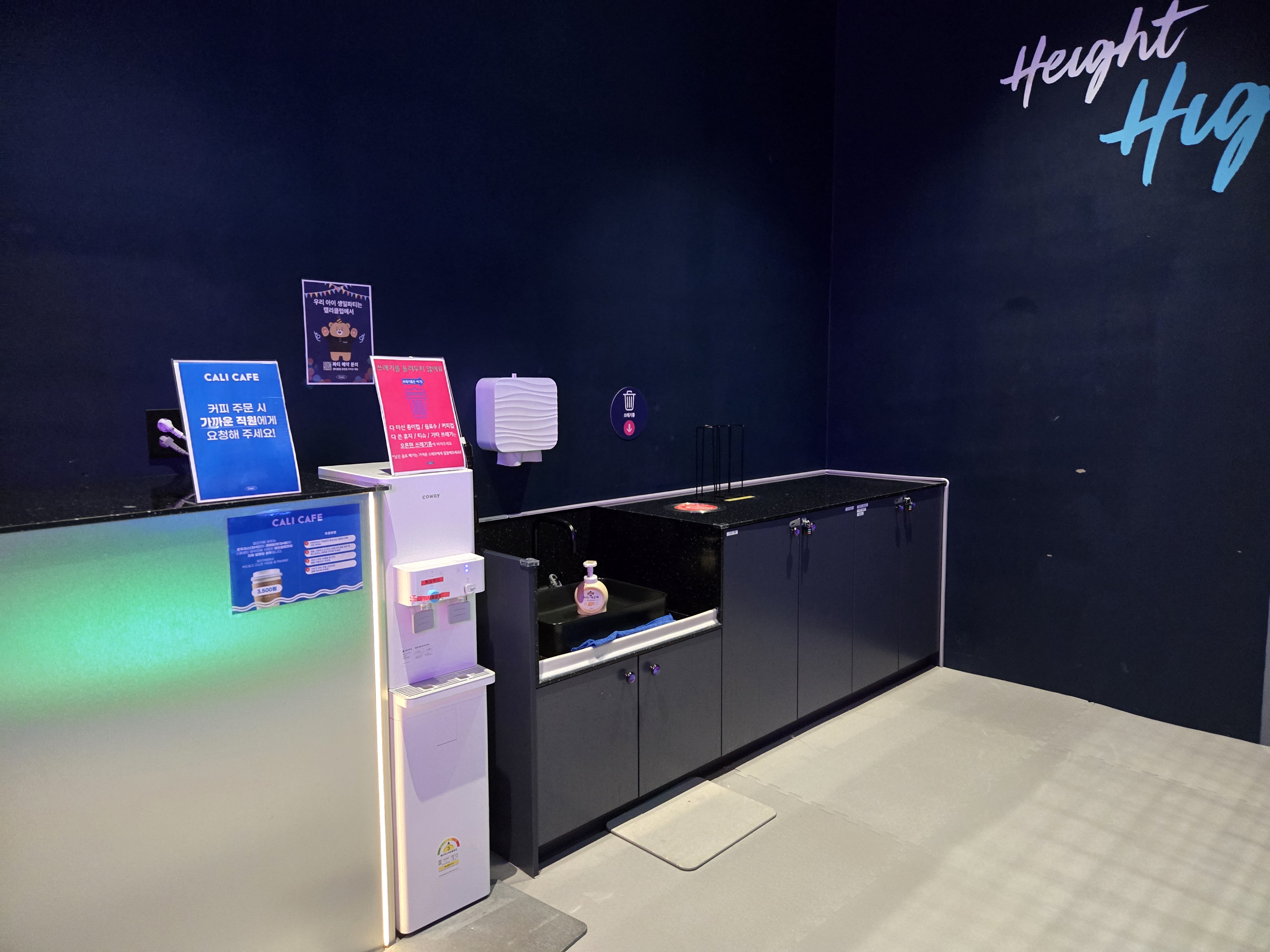 들어가자마자 입구에는 카페와 간식이 파는 공간이 있고, 그 옆으로 정수기와 손 씻는 곳도 있습니다.
