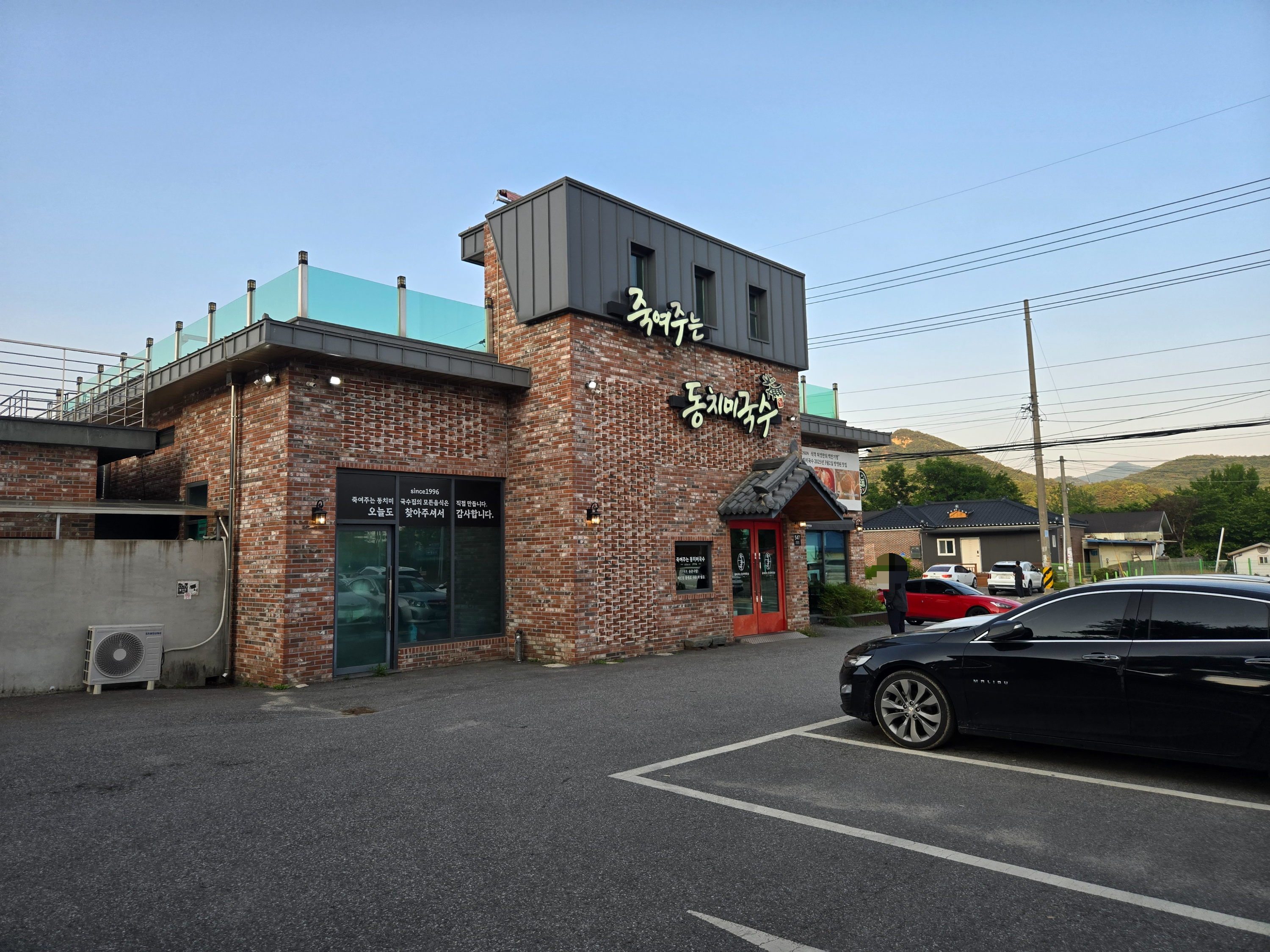 붉은 벽돌로 지어진 깔끔한 외관의 죽여주는 동치미국수에 도착했습니다.