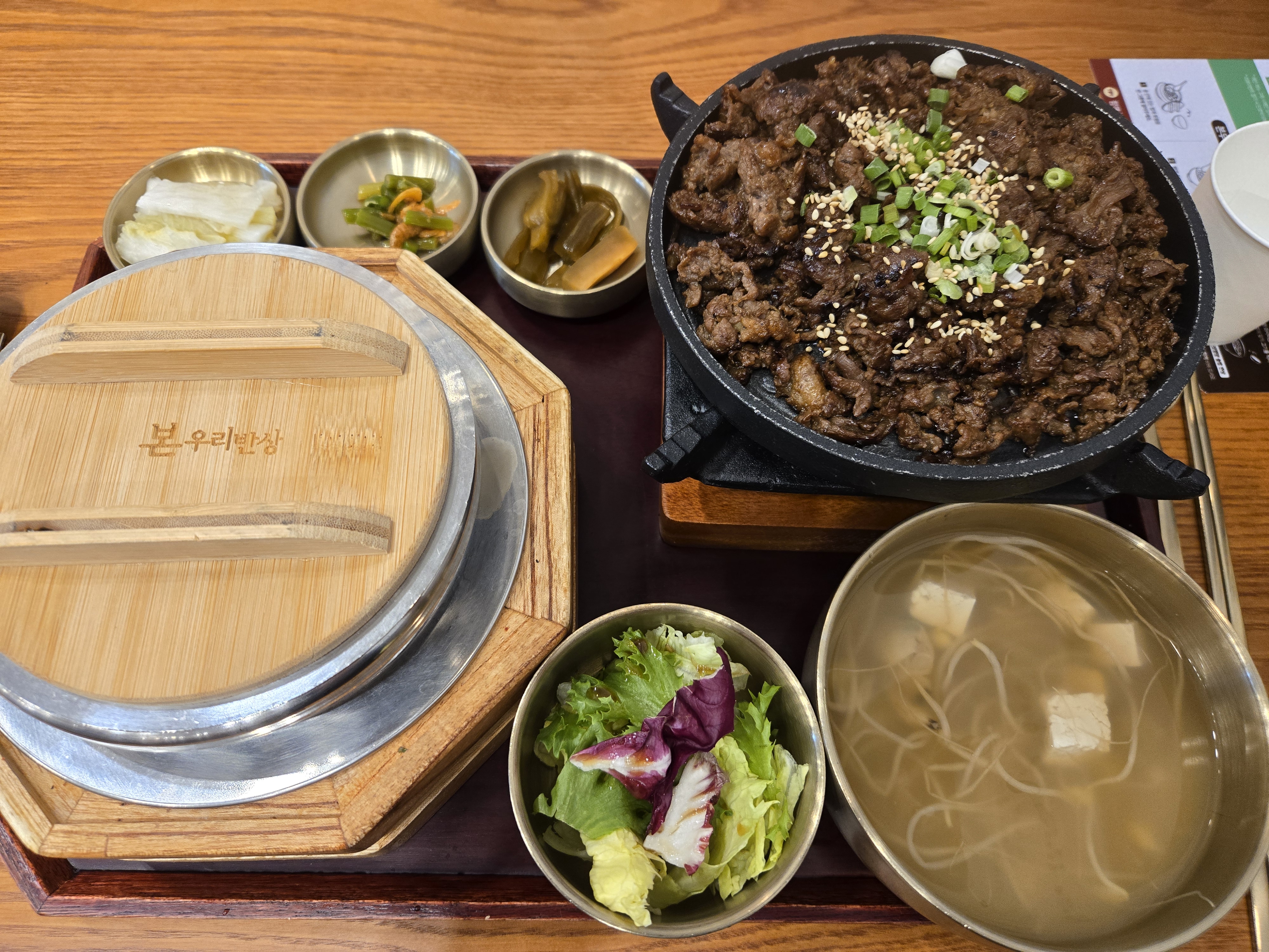 반찬 3가지와 샐러드, 기본 국과 밥, 바싹불고기가 나왔습니다.