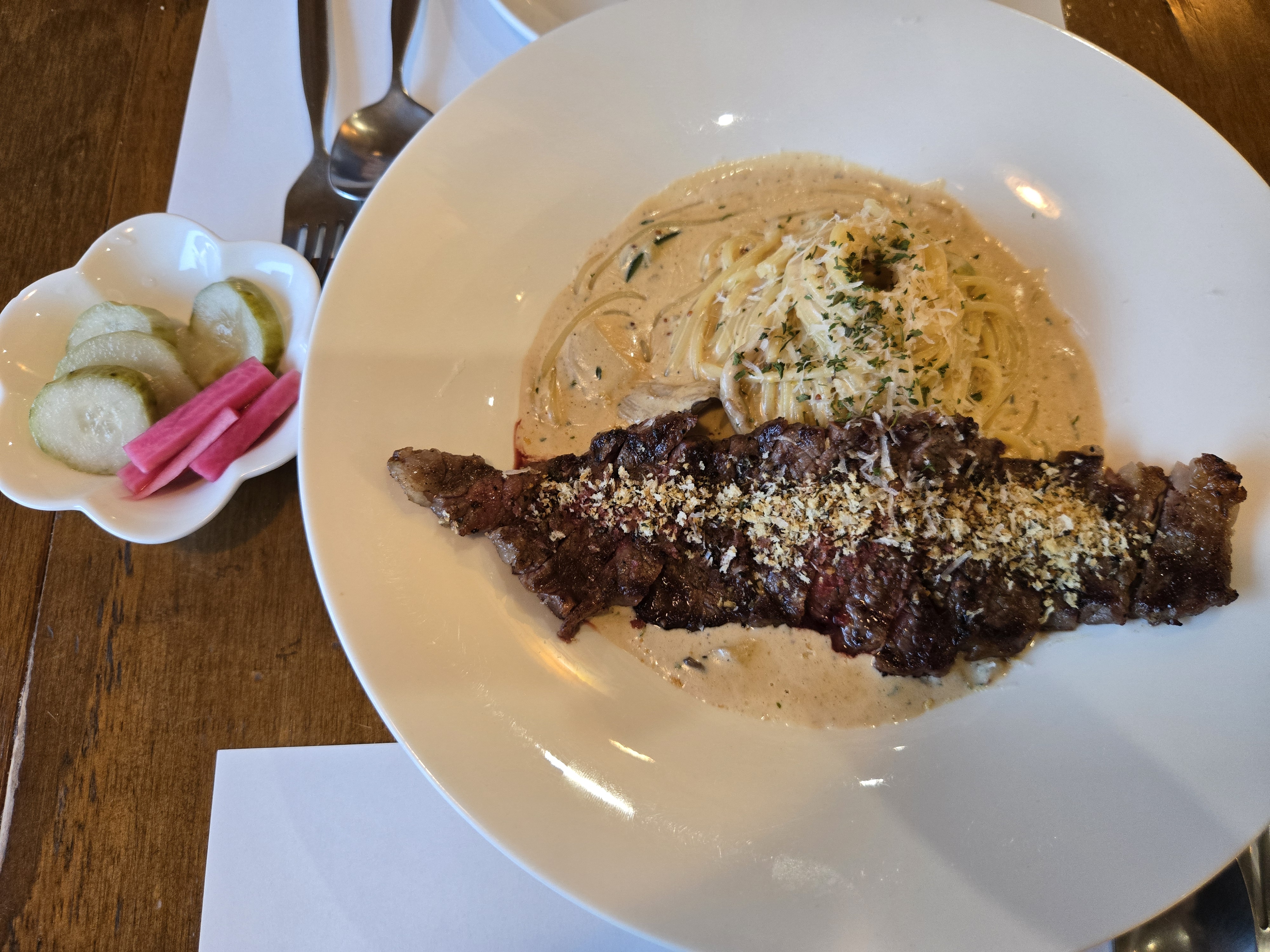 다음으로 스테이크크림파스타가 나왔습니다~