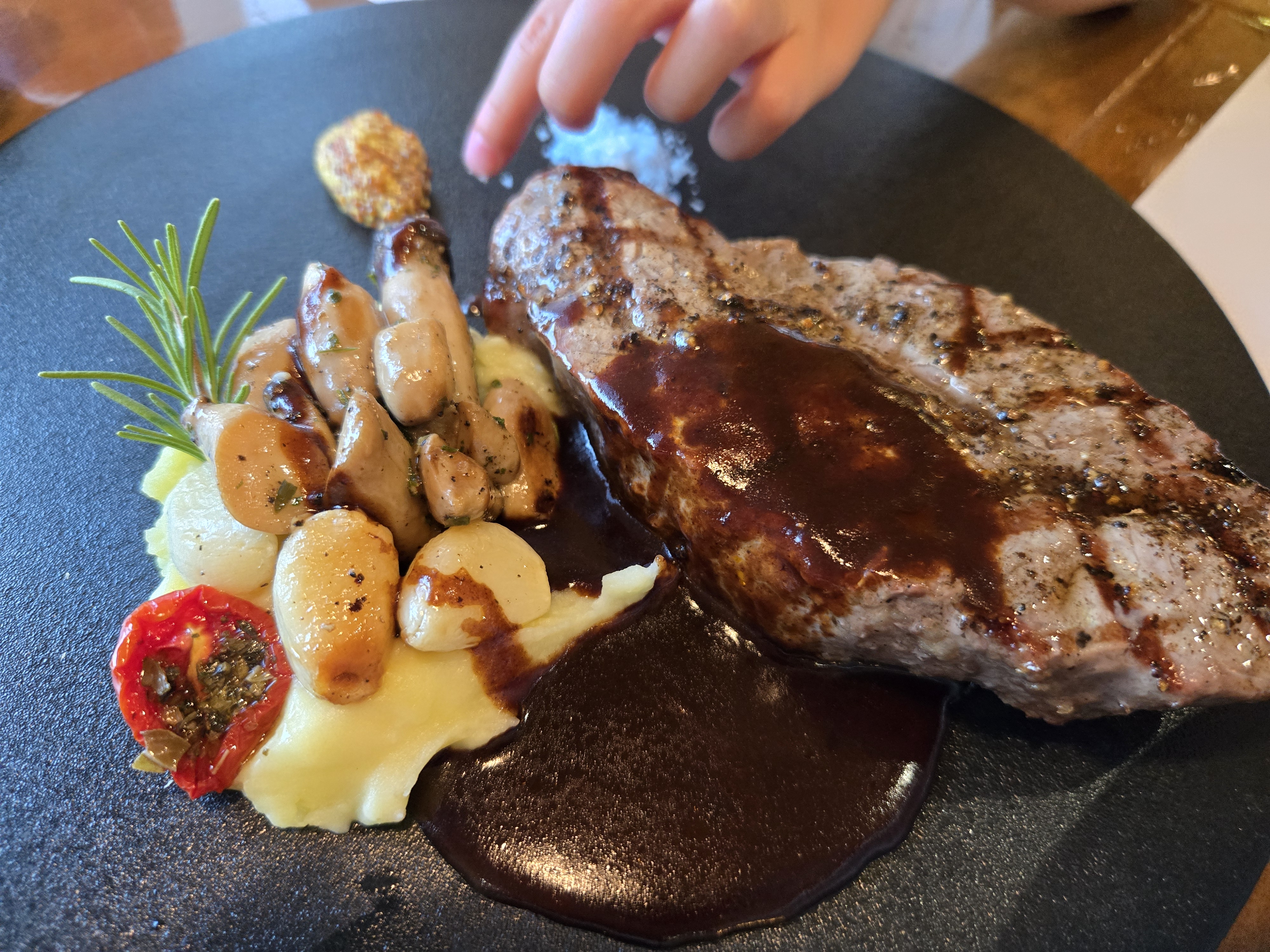 두툼한 채끝 200그램과 버섯, 마늘, 감자샐러드와 같은 각종 가니쉬가 있었습니다.
